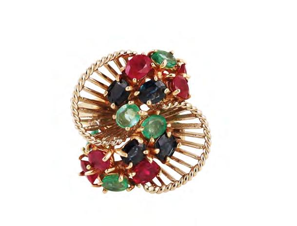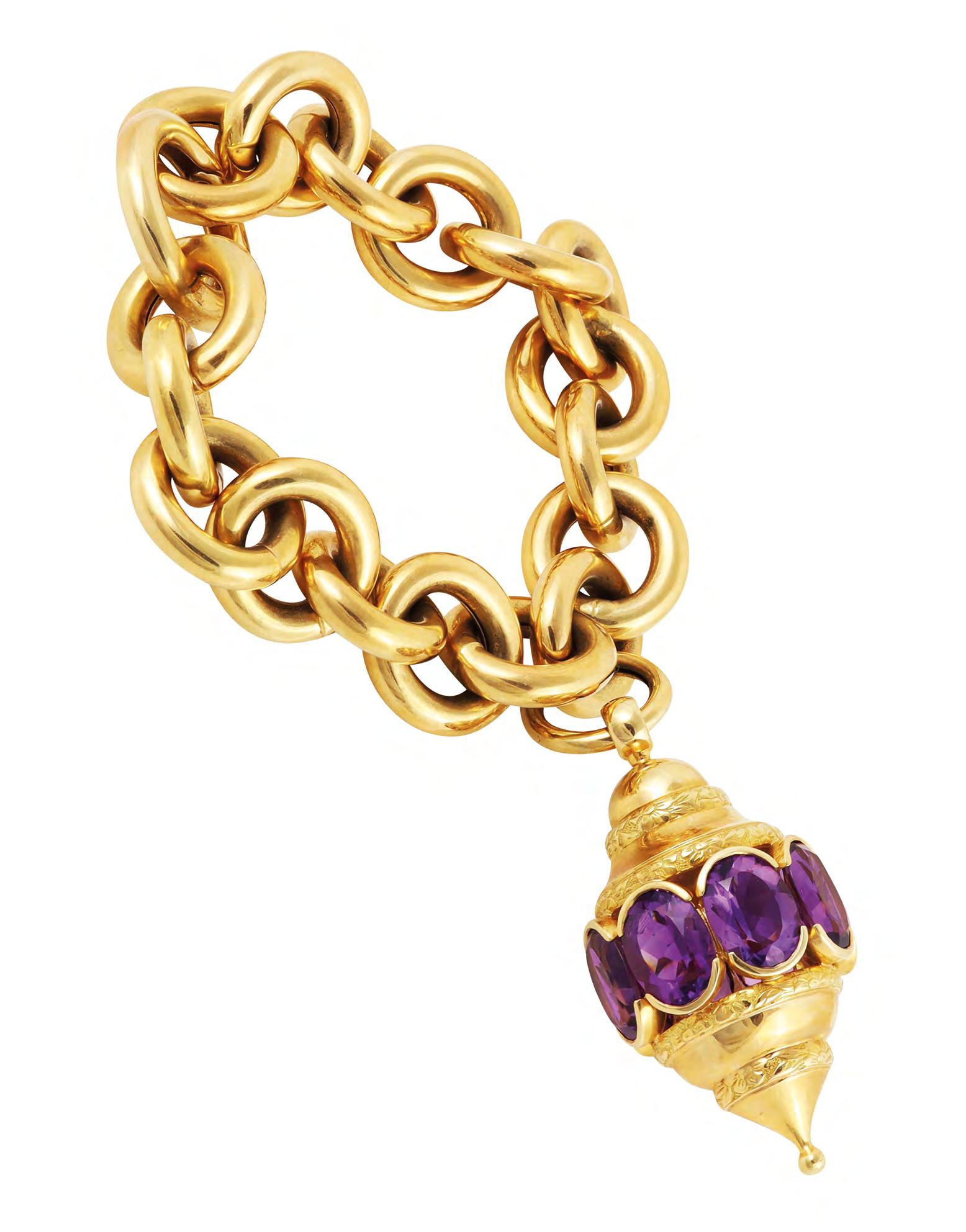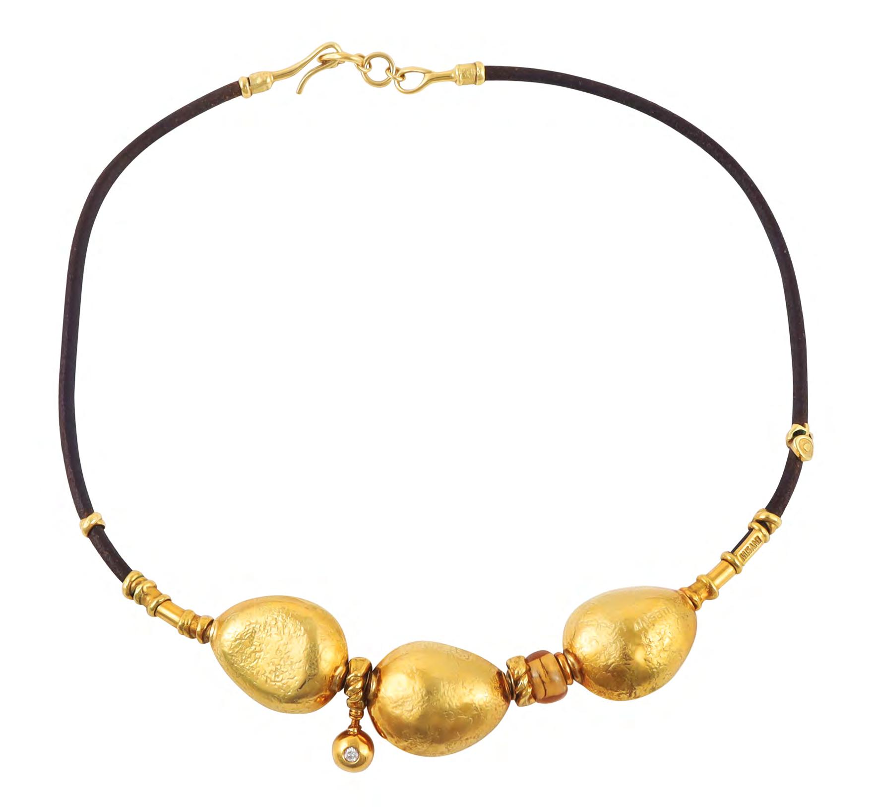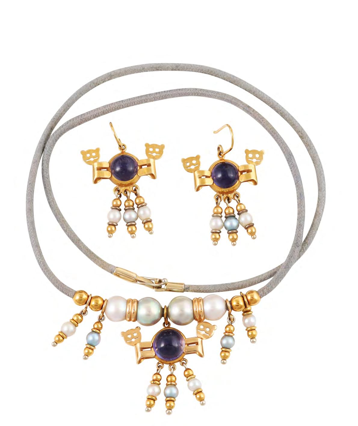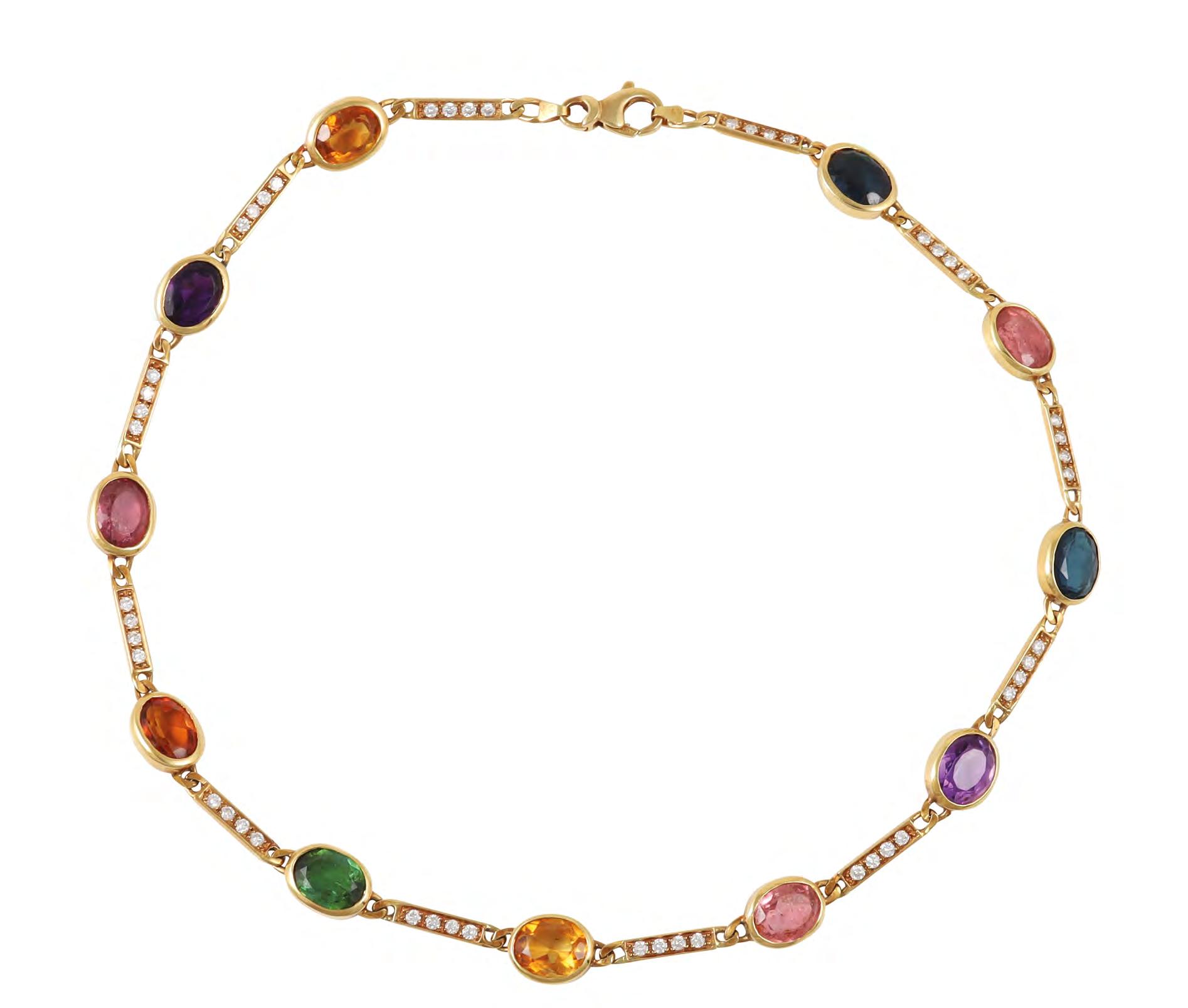 in oro giallo con ovetti pendenti in argento dorato, smalti e pietre sintetiche, gr. lordi 54,8. Lunghezza 20 cm