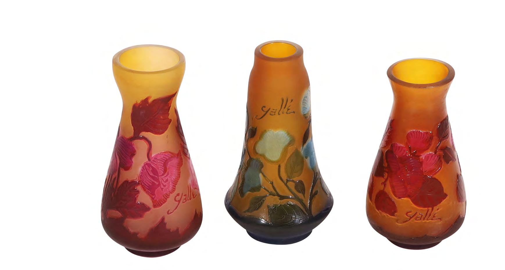 TRE PICCOLI VASI in vetro cammeo con decori floreali. Altezza 13 cm e 12 cm ca. Recano l’inscrizione: Gallé