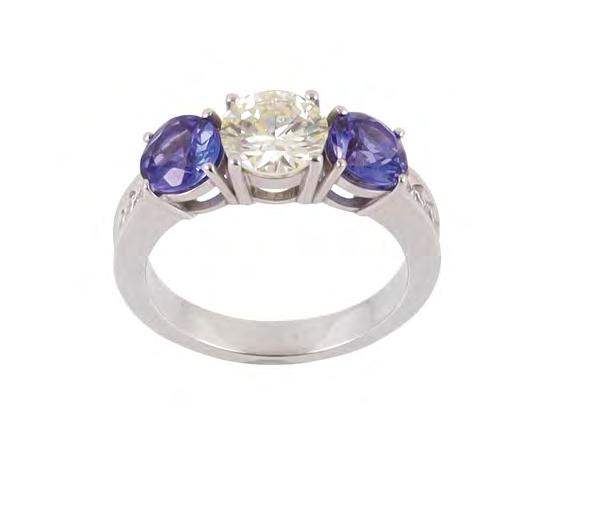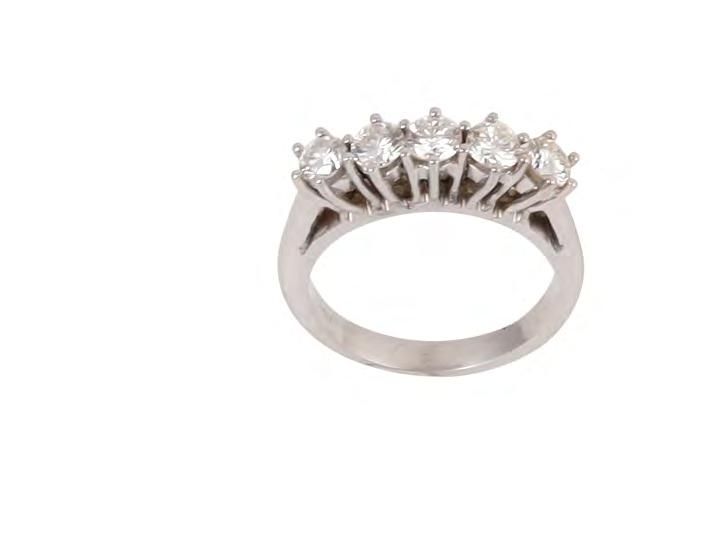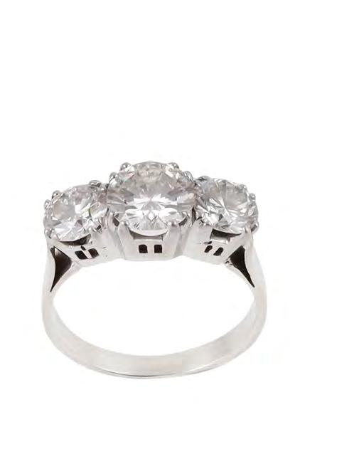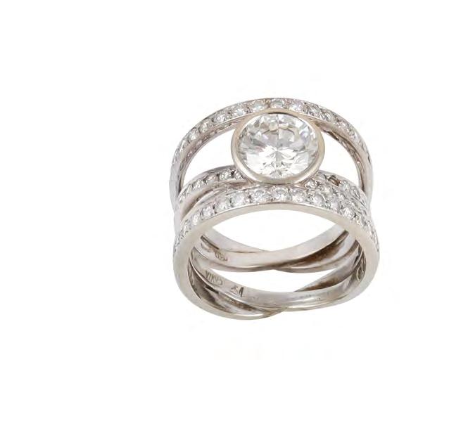 “trilogy” in platino con brillante centrale del peso di 1,40 ct ca. e due brillanti laterali del peso complessivo di 1,60 ct ca., gr. 5,8. Misura 16