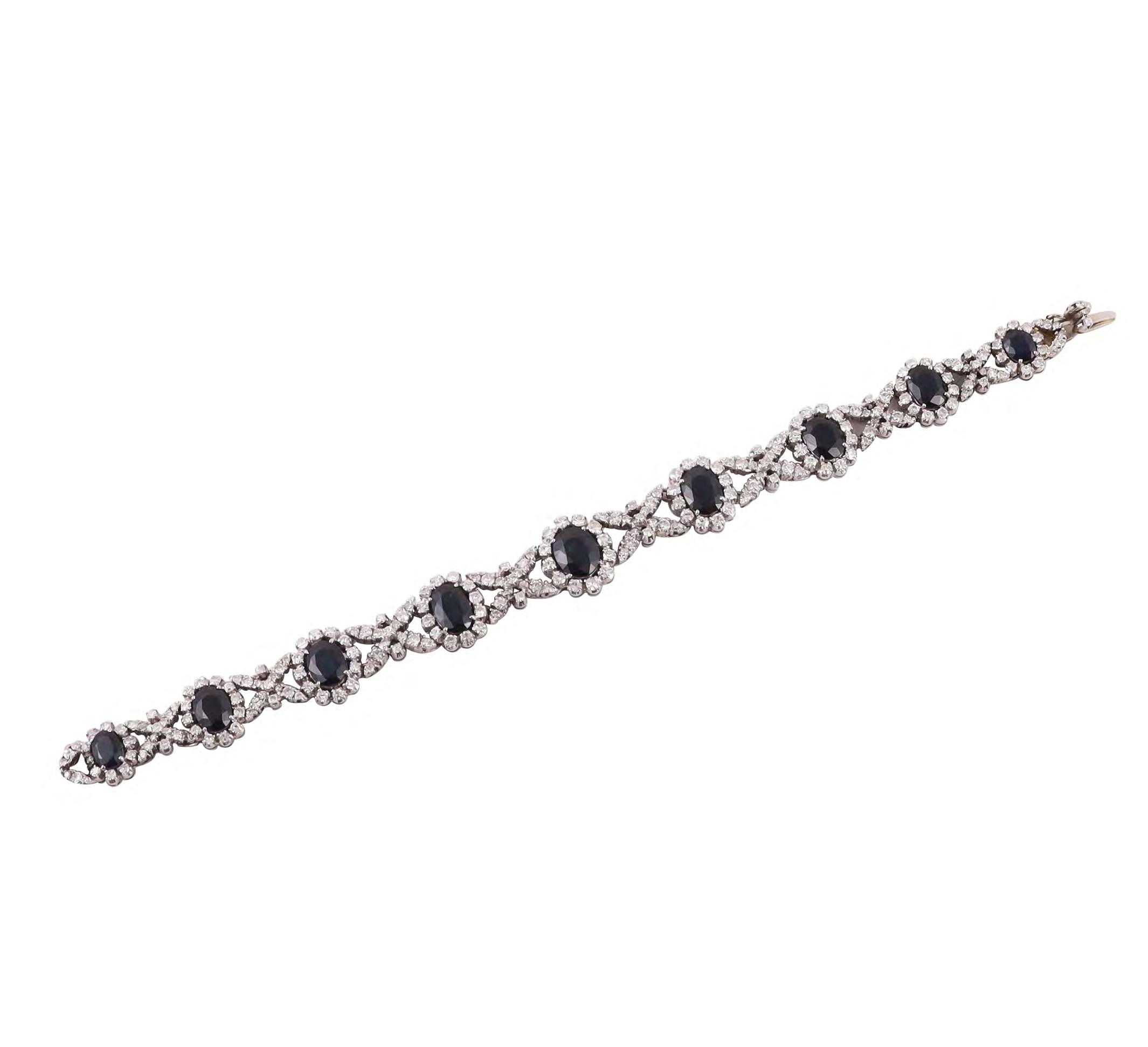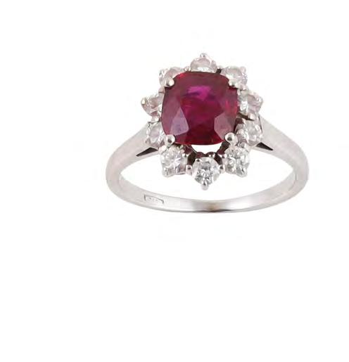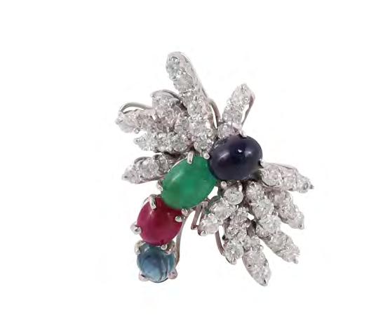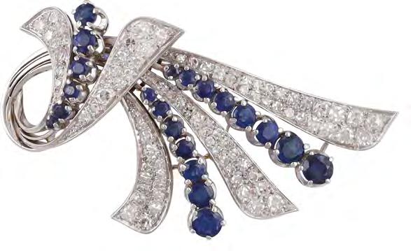 in oro bianco evidenziato al centro da uno zaffiro taglio a cuscino del peso di 17 ct ca., ornato da brillanti del peso complessivo di 1 ct ca., gr. 12,9.