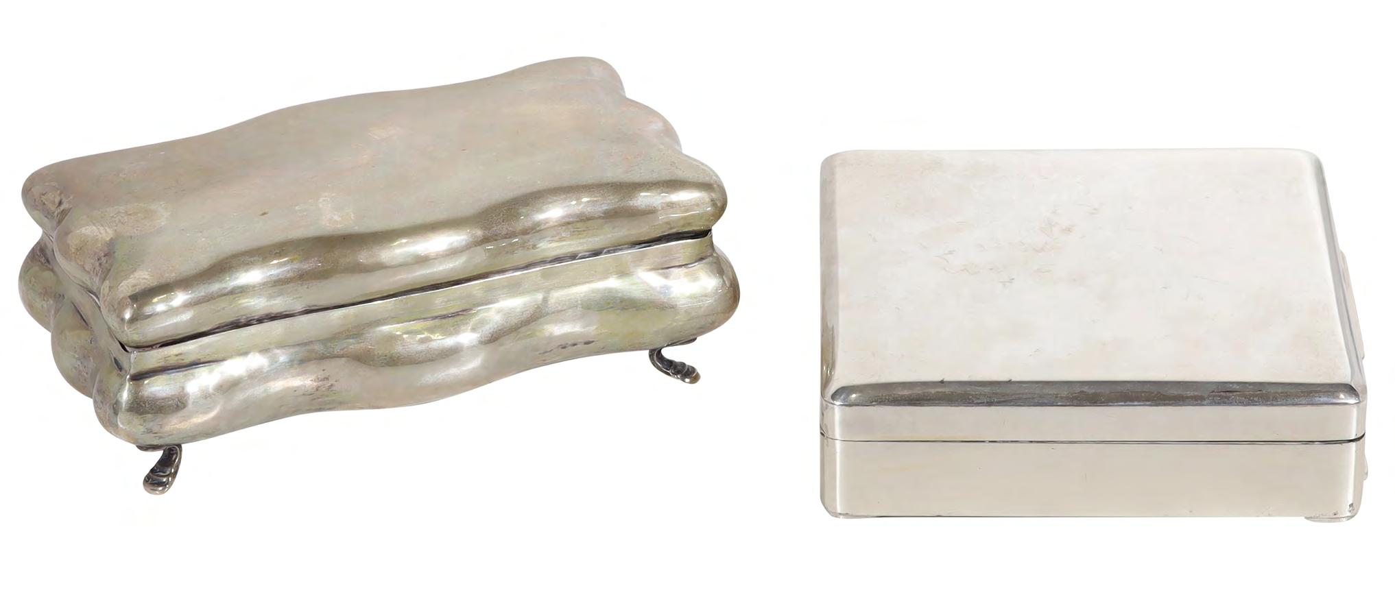 rispettivamente a forma quadrata in argento 925 liscio con coperchio, gr. 480 ca. e a forma rettangolare in argento 800 con baccellature, poggiante su piedini, quest’ultima riporta impresso il numerario 47 PD corrispondente all’Argenteria “S. Marco” di Vittorio Minozzi - Padova, gr. 440 ca.