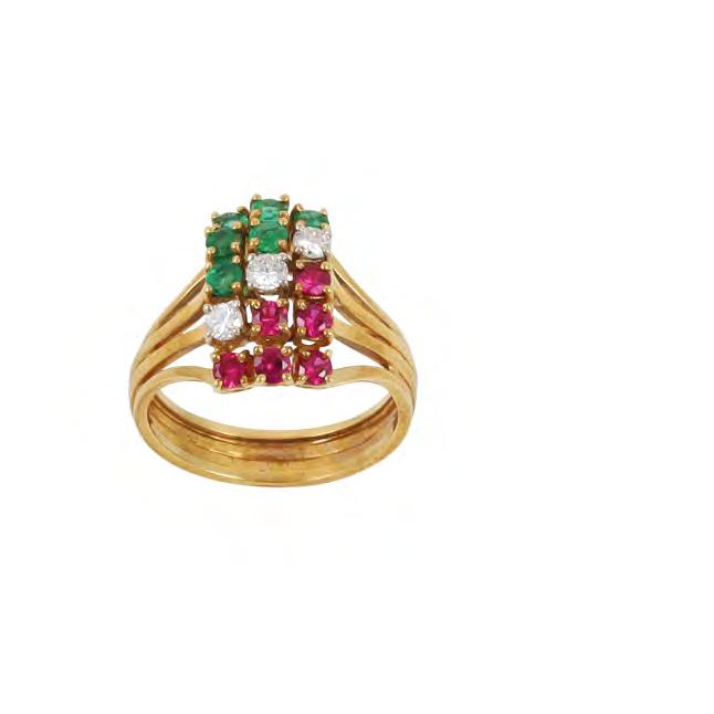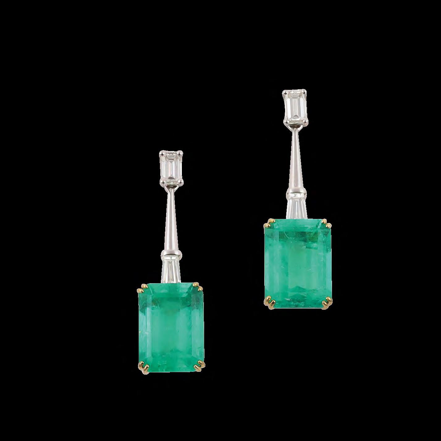 ANELLO, SMERALDO COLOMBIA in oro bianco e giallo con smeraldo rettangolare ad angoli tronchi del peso di 8,90 ct ca., affiancato da due diamanti triangolari, gr. 6,2.