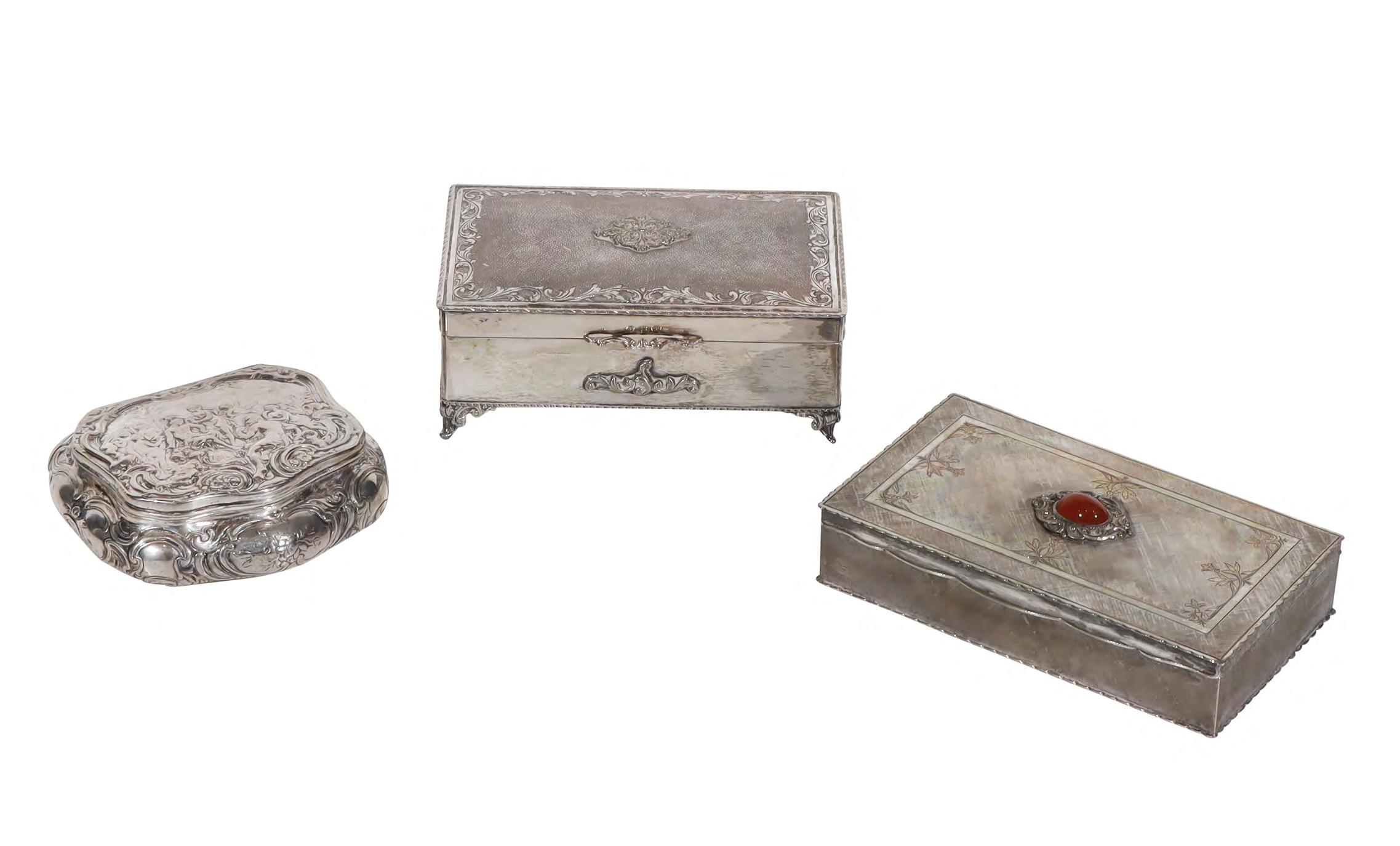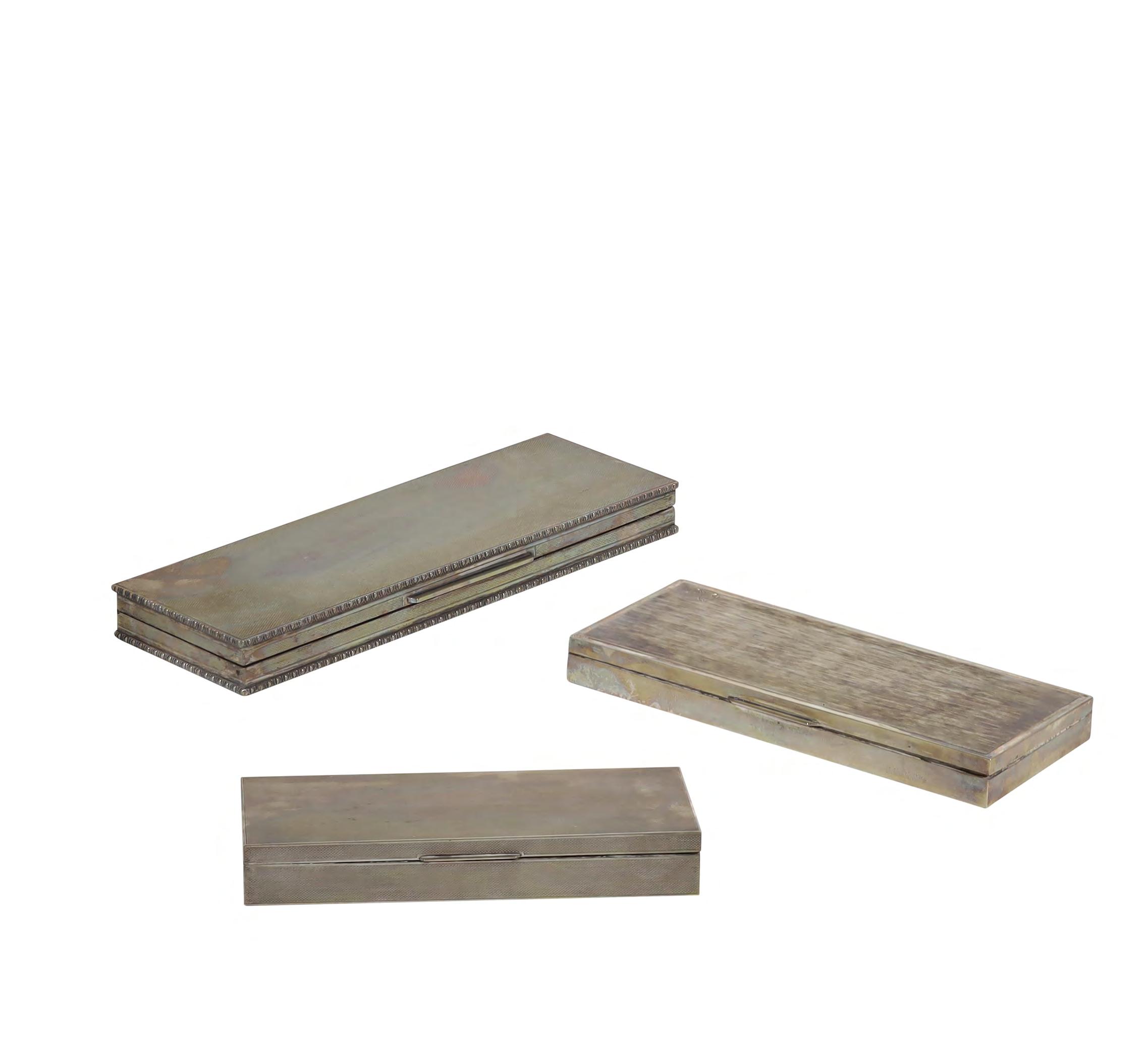 TRE SCATOLE PORTASIGARETTE in argento a forma rettangolare con coperchio, gr. complessivi 1.560 ca. Dimensioni 25 x 8,5 (h) 2,5 cm ca.; 21 x 9 (h) 2 cm ca.; 21 x 8,5 (h) 3 cm ca.