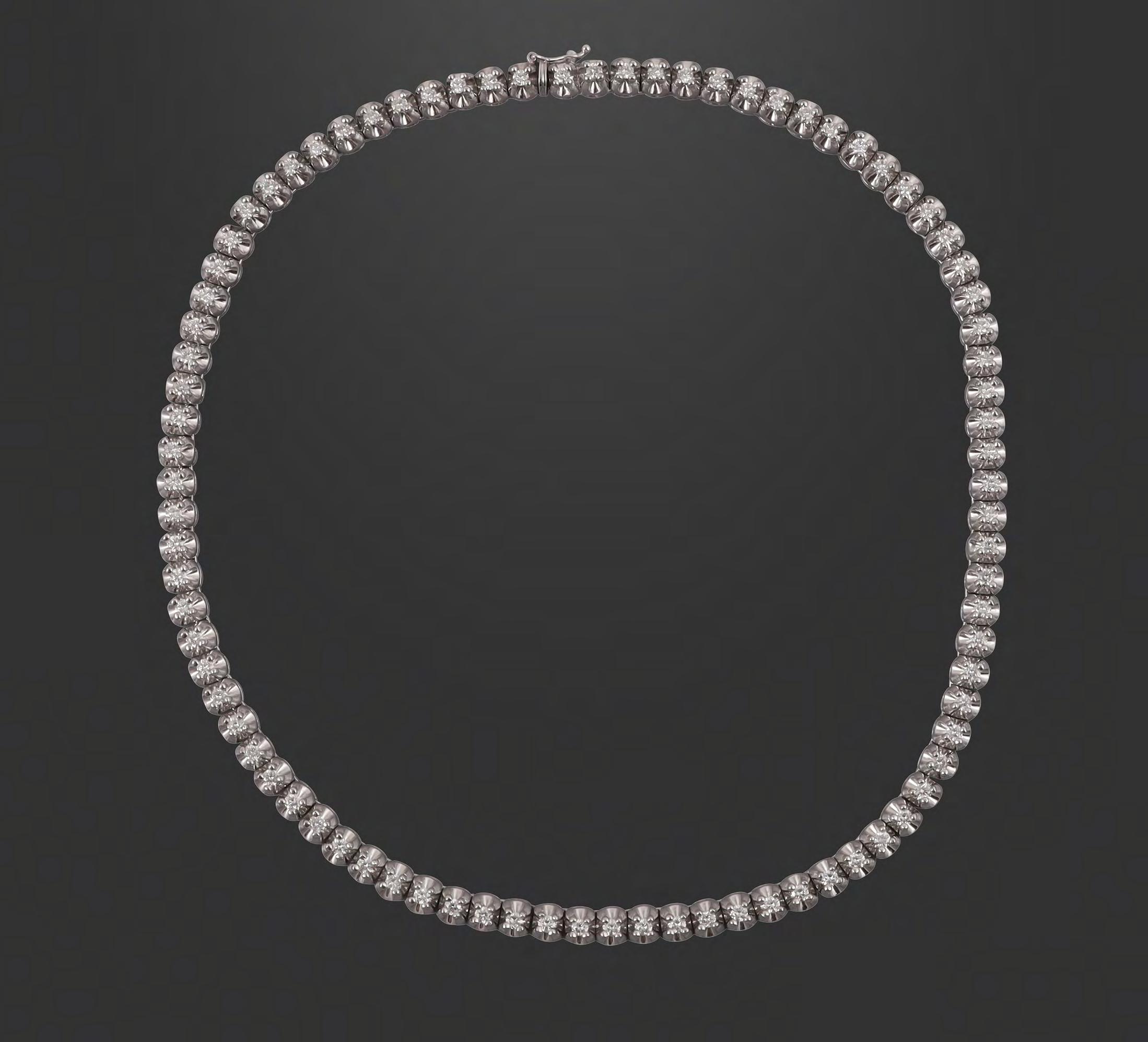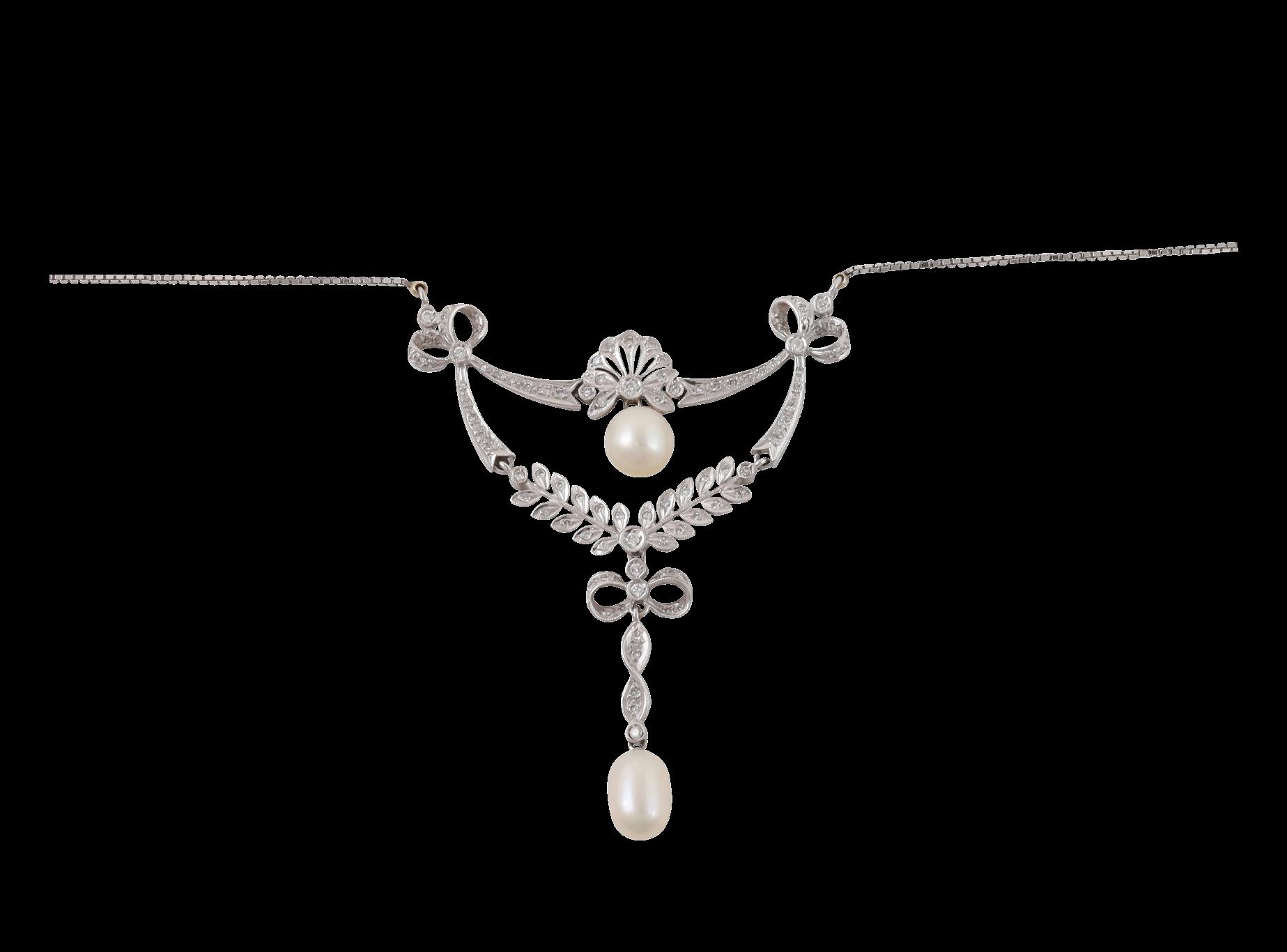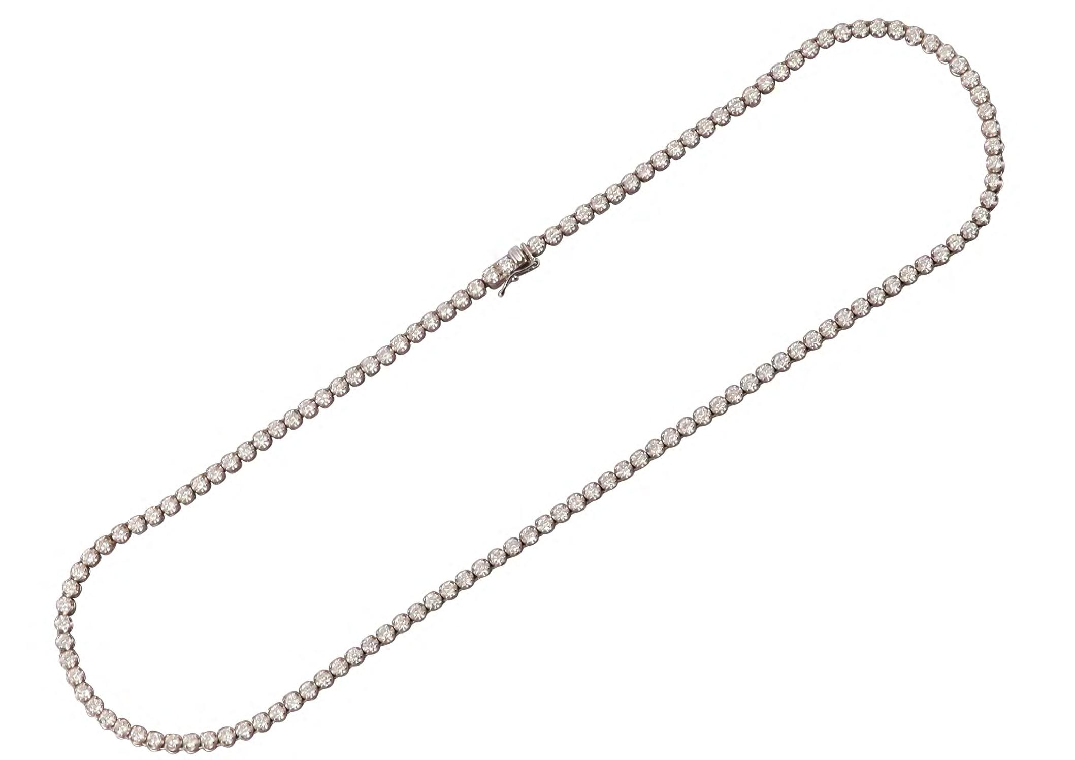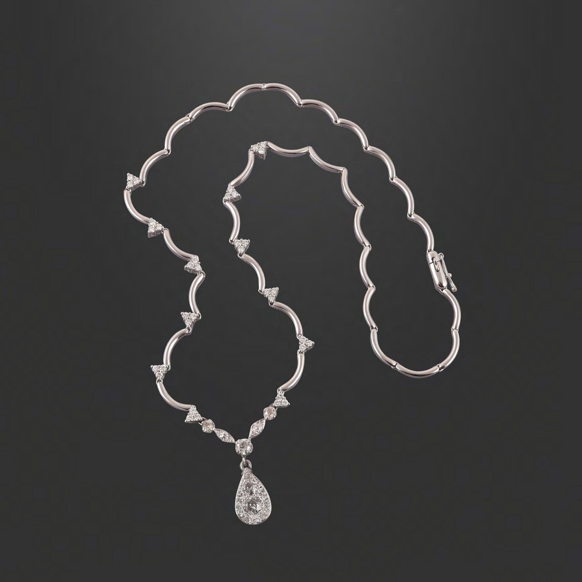 in oro bianco con tormalina verde a forma rettangolare con lati curvi, impreziosito da brillanti, diamanti taglio navette e carrè, sorretto da catenina girocollo, gr. complessivi 8,8. Diamani del peso complessivo di 2 ct ca.