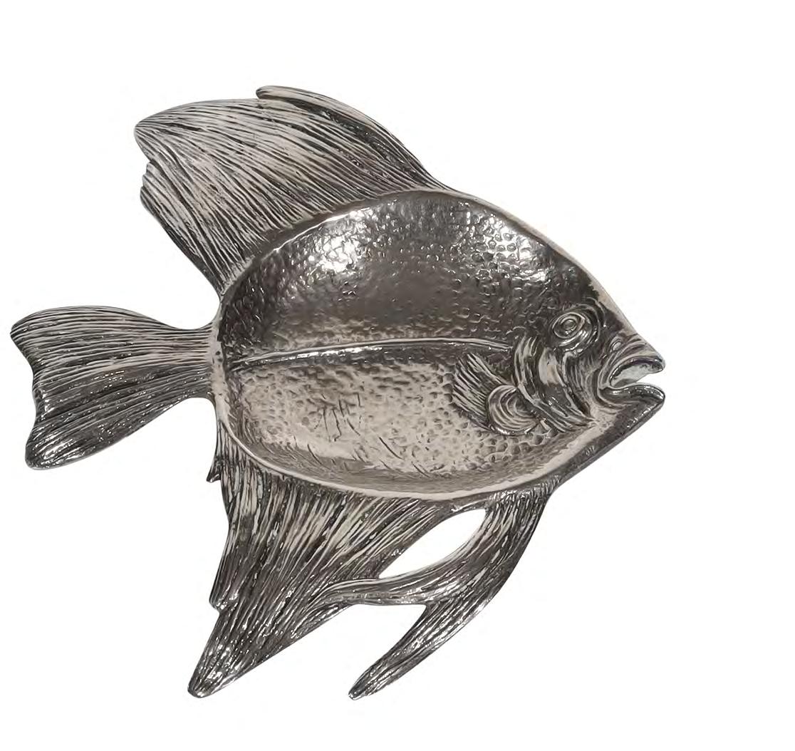 PORTAOGGETTI in argento a forma di pesce, gr. 250 ca. Dimensioni 15,5 x 14 (h) 1,5 cm ca. Numerario 26 MI (Pradella IllarioMilano) per Rosa Torino