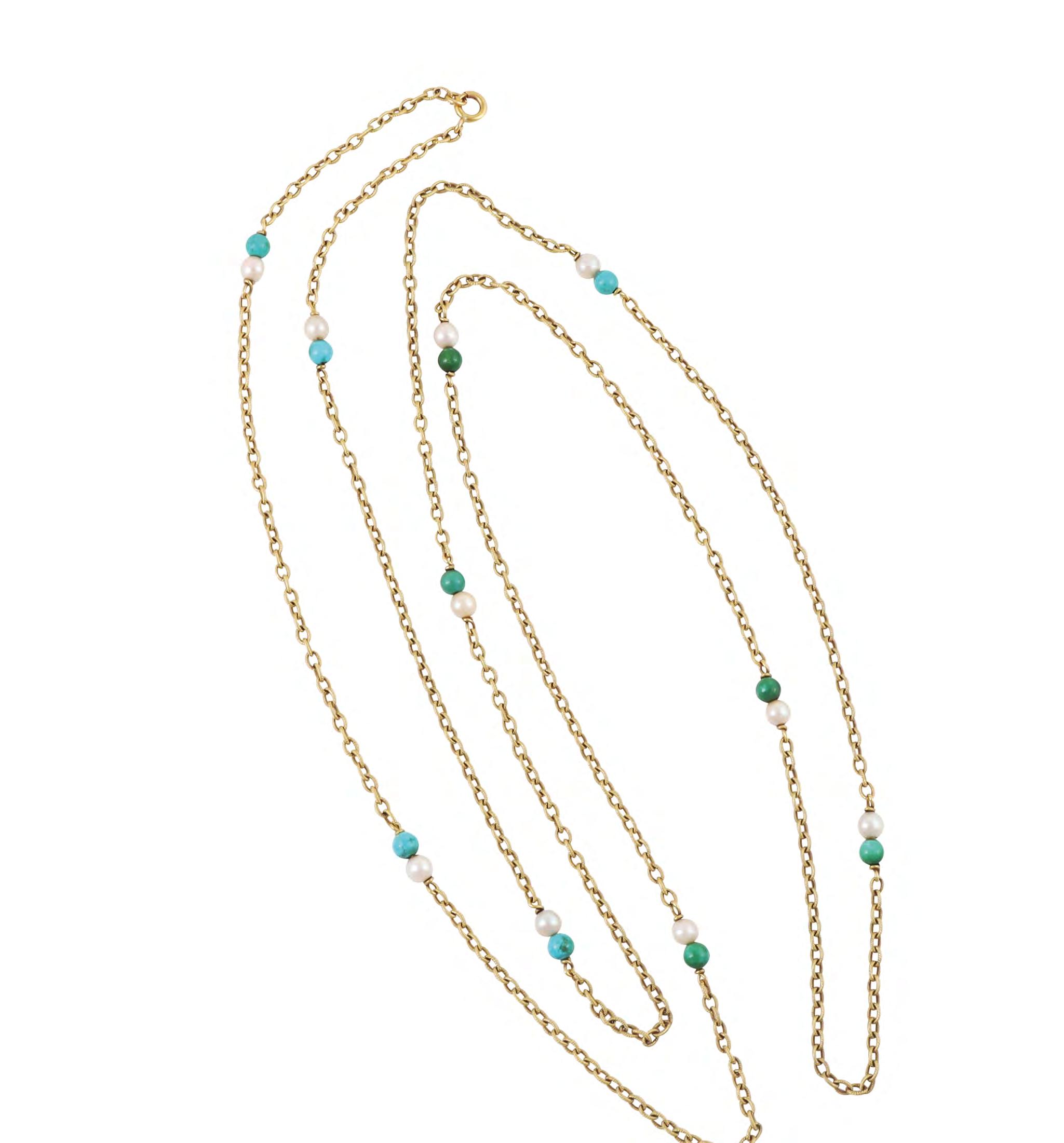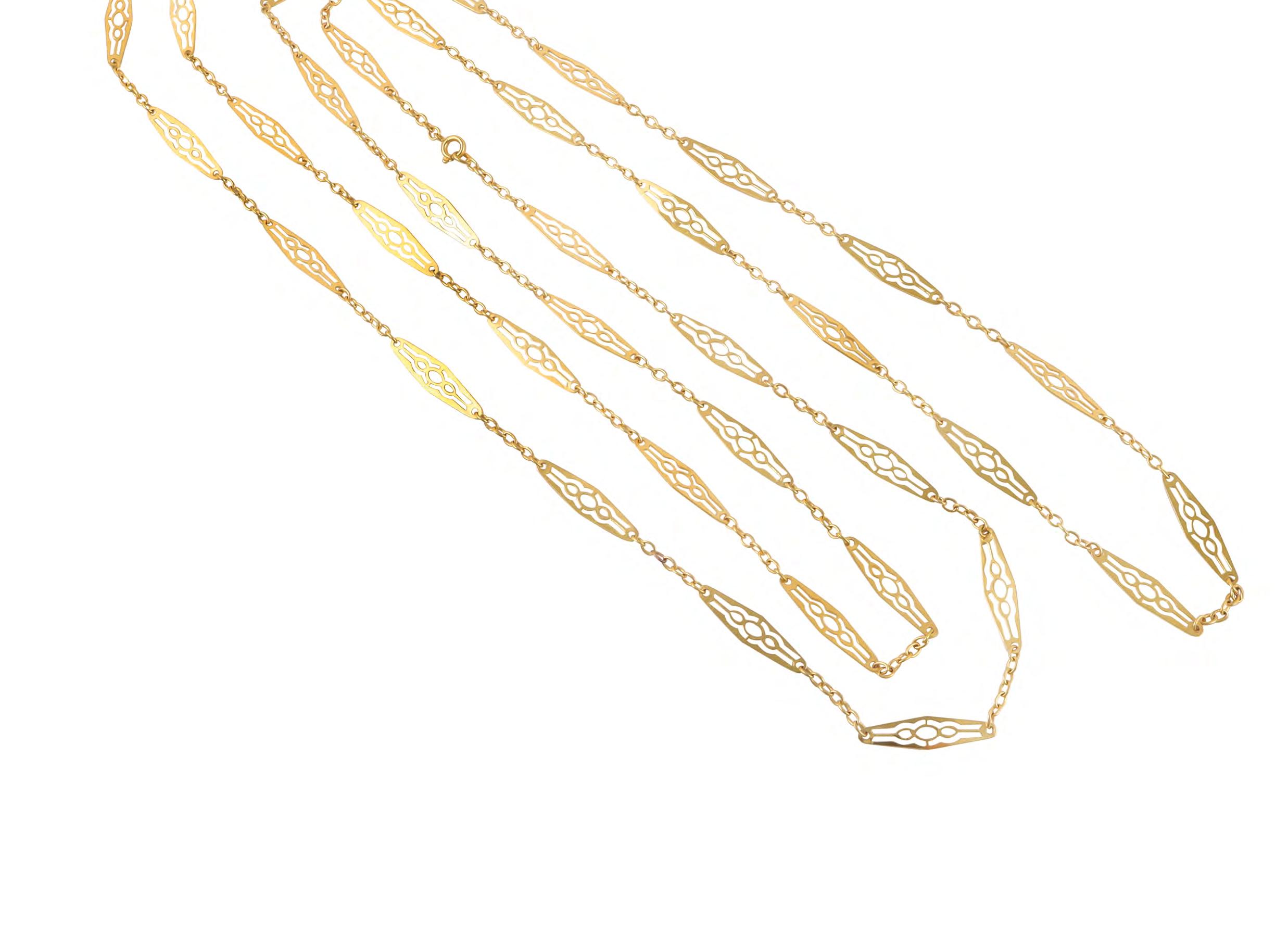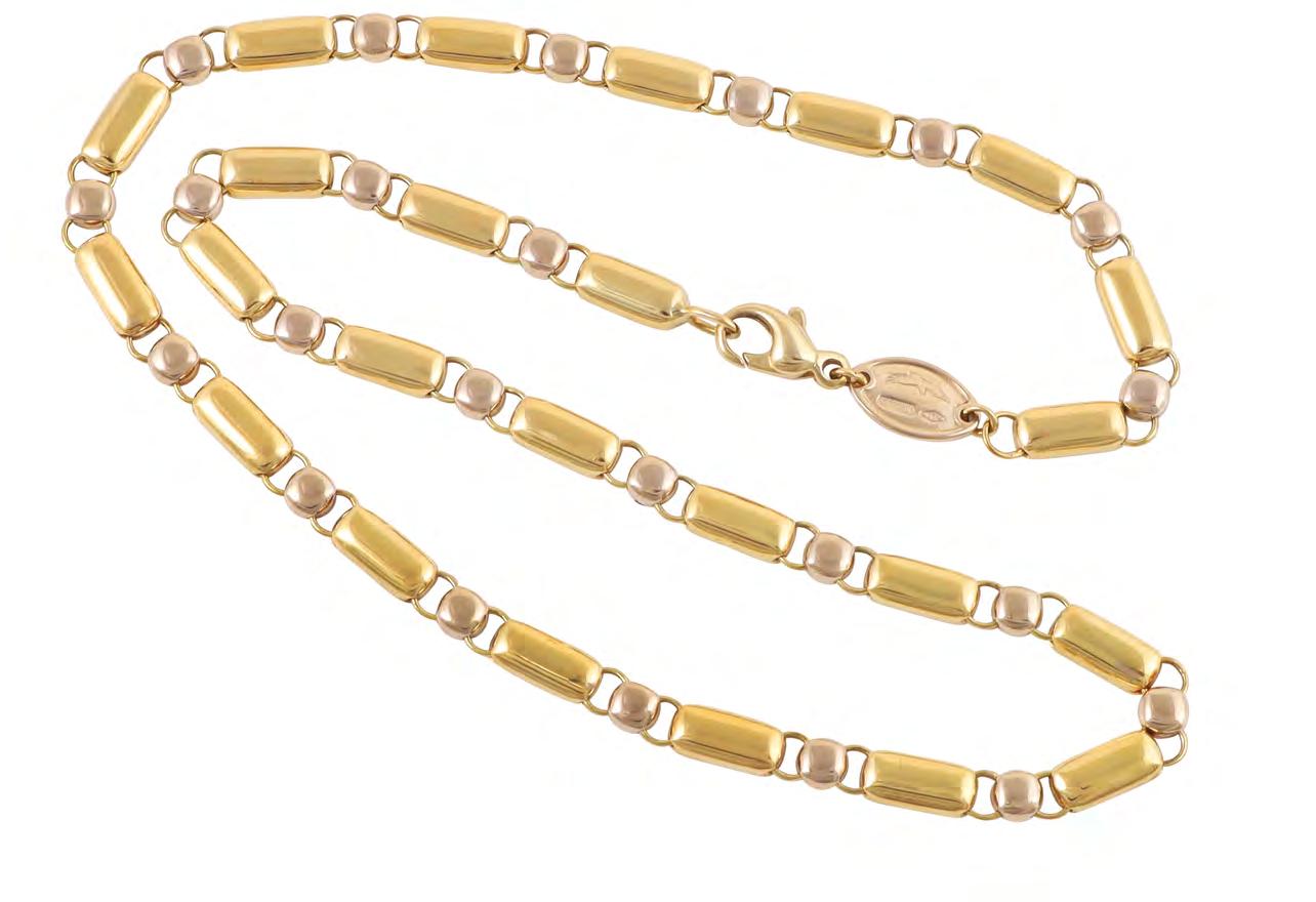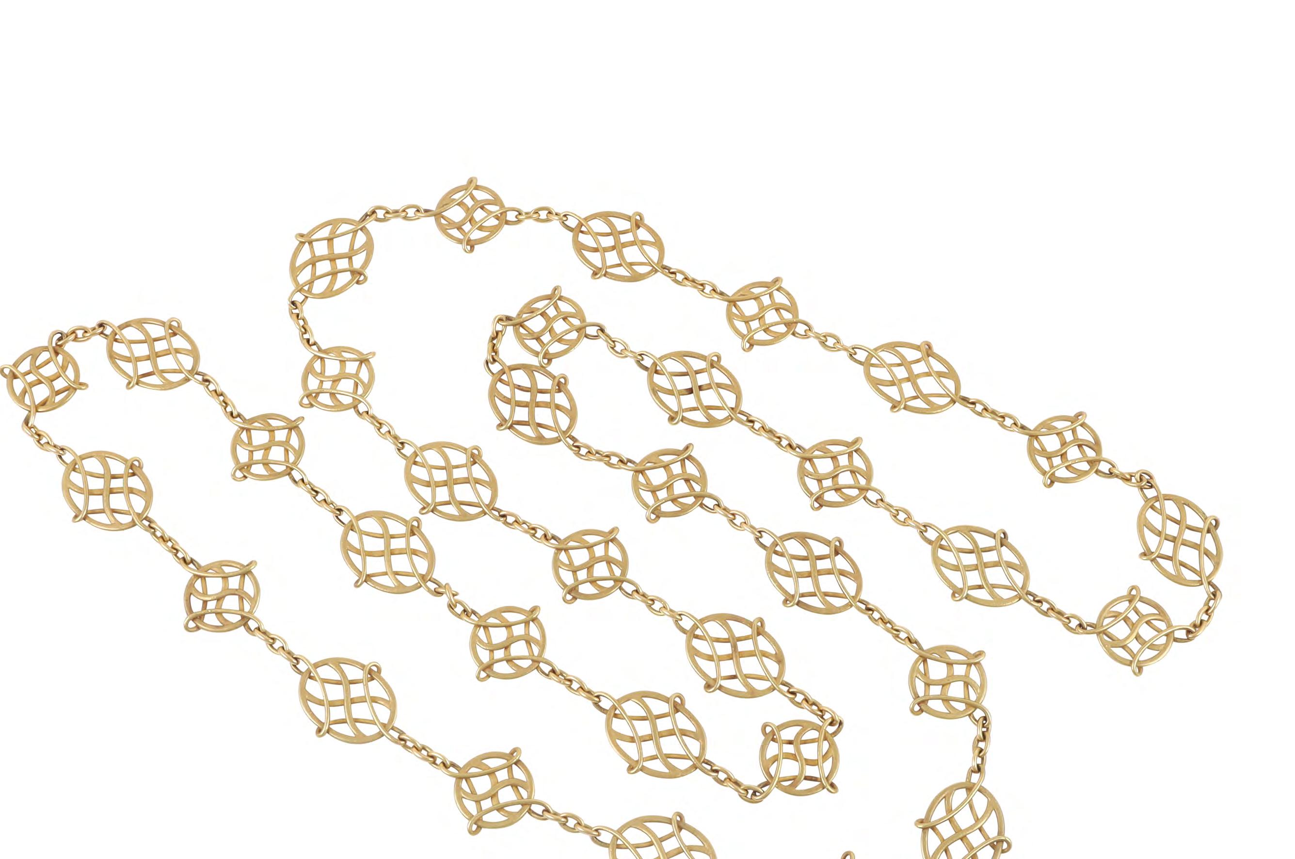 LUNGA COLLANA in oro giallo costituita da elementi ovali e tondi, raccordati da catenelle, gr. 82,9.