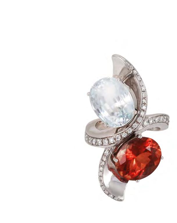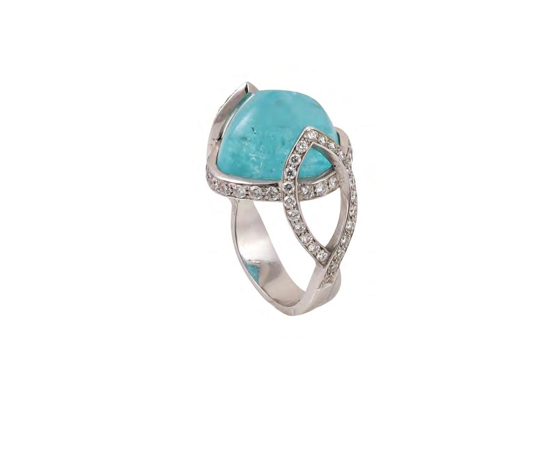 in oro bianco e brillanti, con acquamarina taglio “sugarloaf” posta al centro, affiancata da motivi aperti a navetta, gr. 13,4.