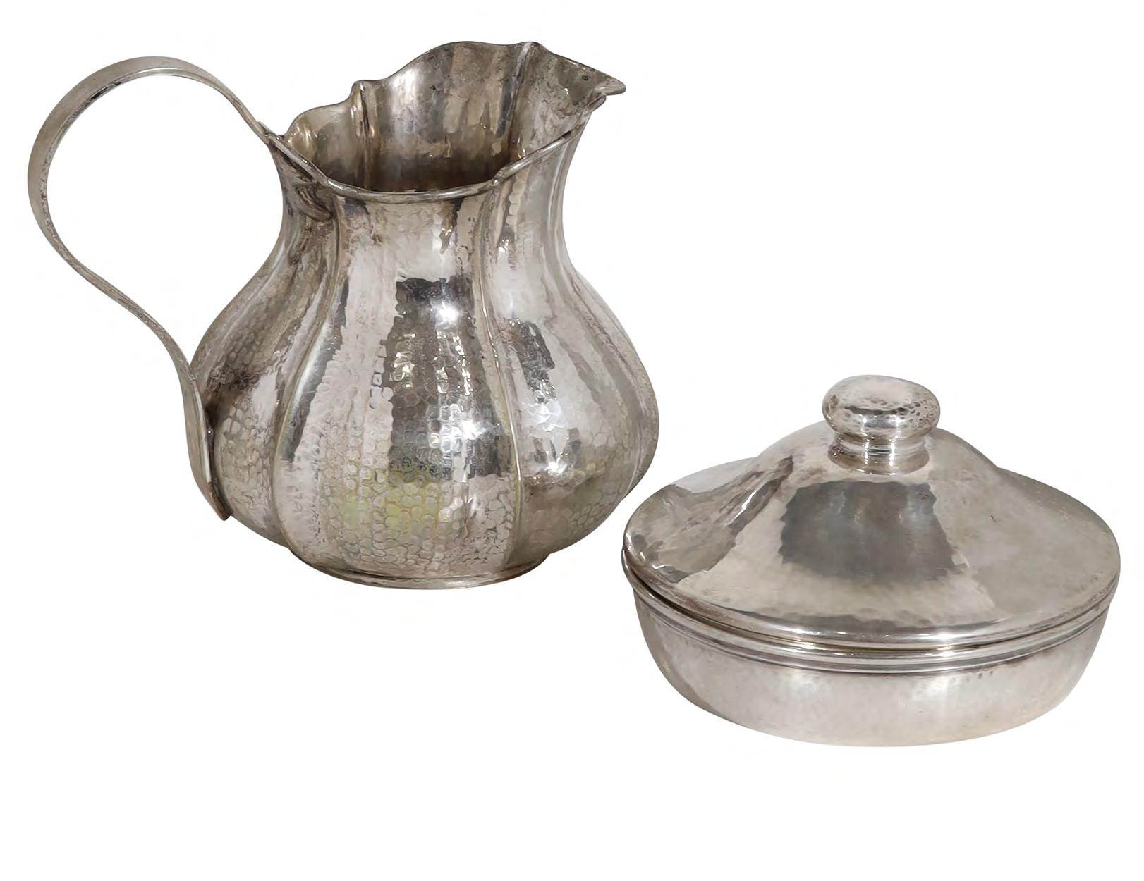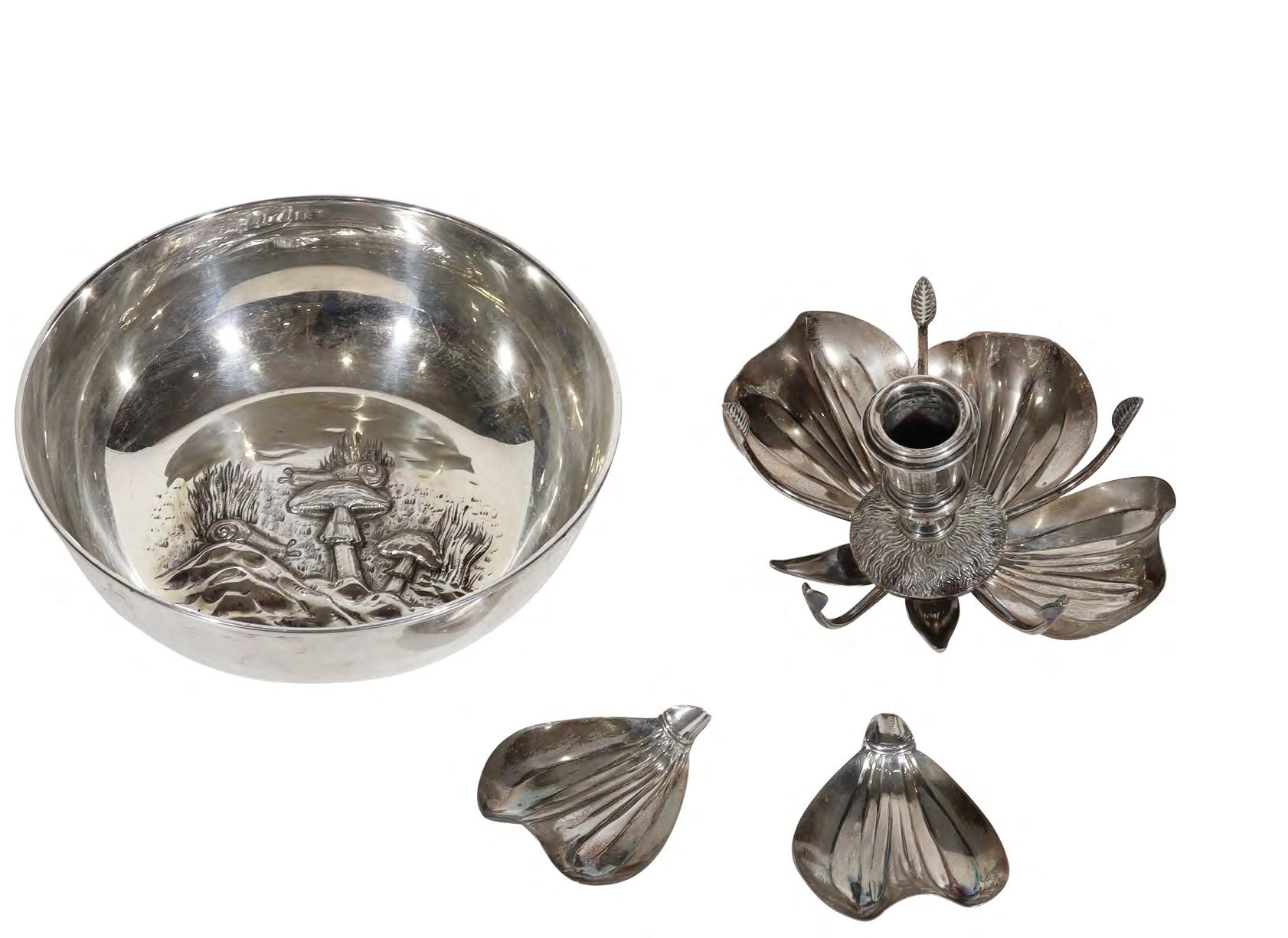 in argento composto da ciotola a corpo circolare con motivo naturalistico sbalzato e bugia raffigurante un fiore con petali rimovibili, gr. complessivi 460 ca.