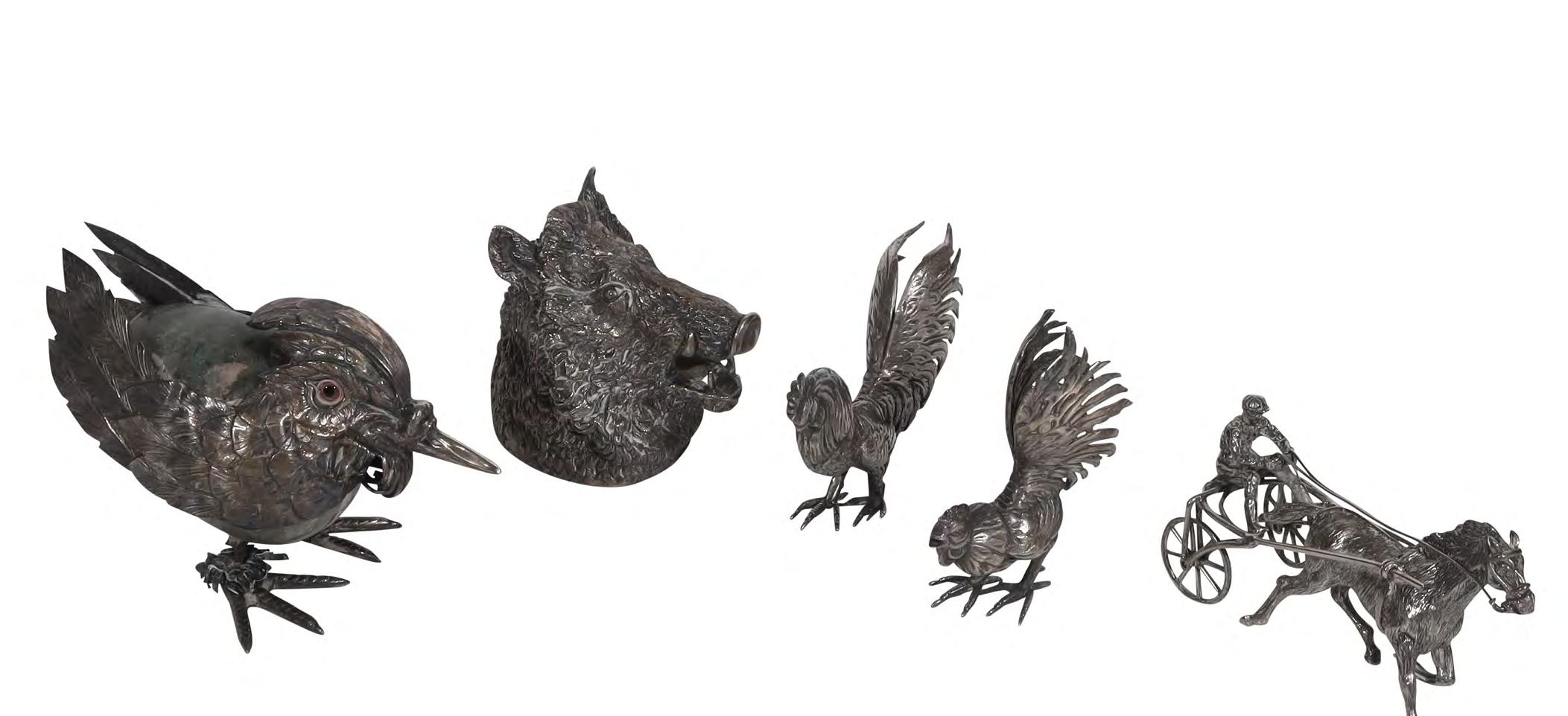 LOTTO DI CINQUE OGGETTI in argento composto da porta accendino modellato a testa di cinghiale, due galli, cavallo con sulky e uccellino con pietra dura (mancanza), gr. complessivi 730 ca. (escluso oggetto con pietra dura). Misure diverse