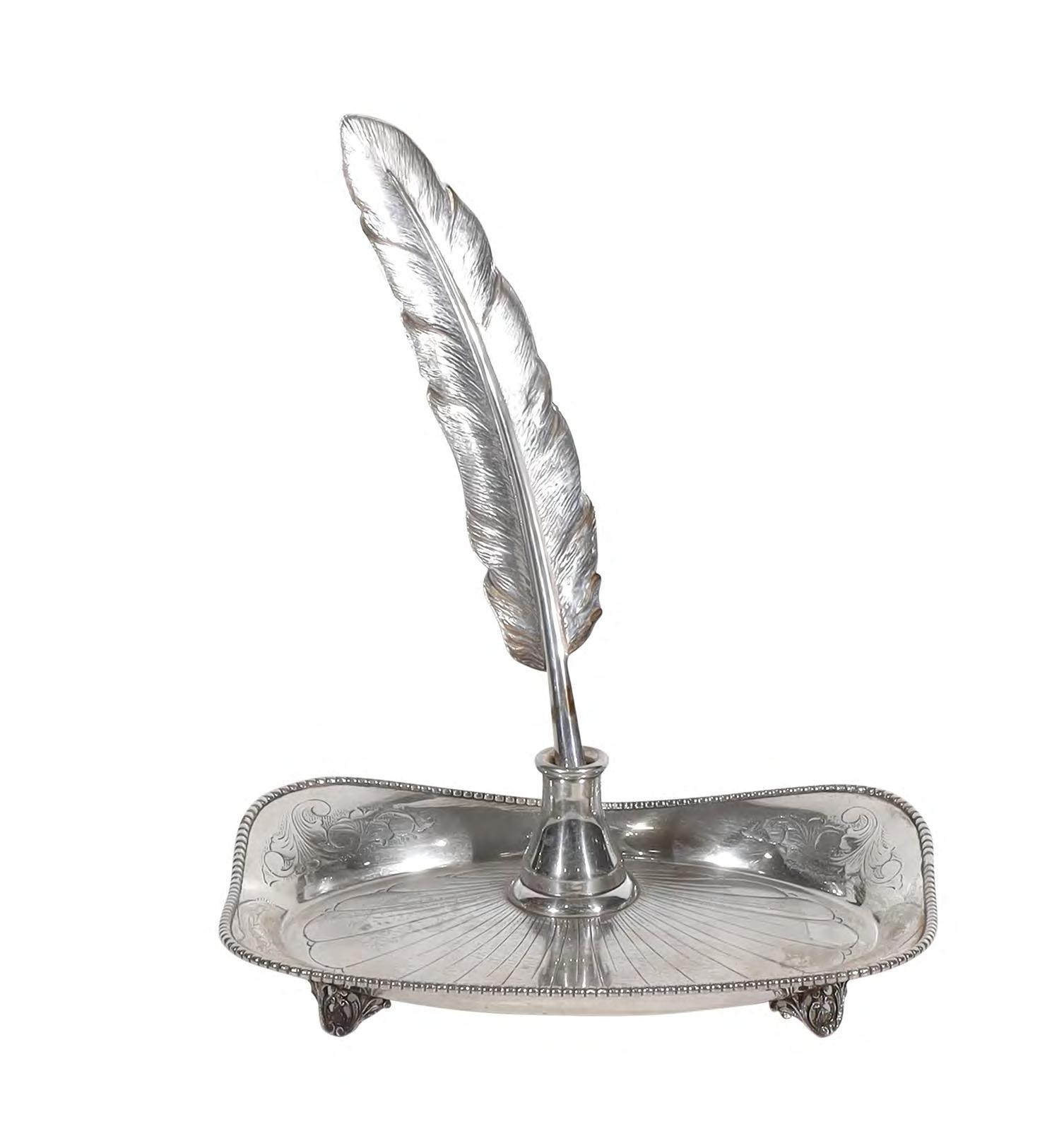 in argento a corpo rettangolare cesellato con penna a sfera (non funzionante) a guisa di piuma, gr. complessivi 204 ca.