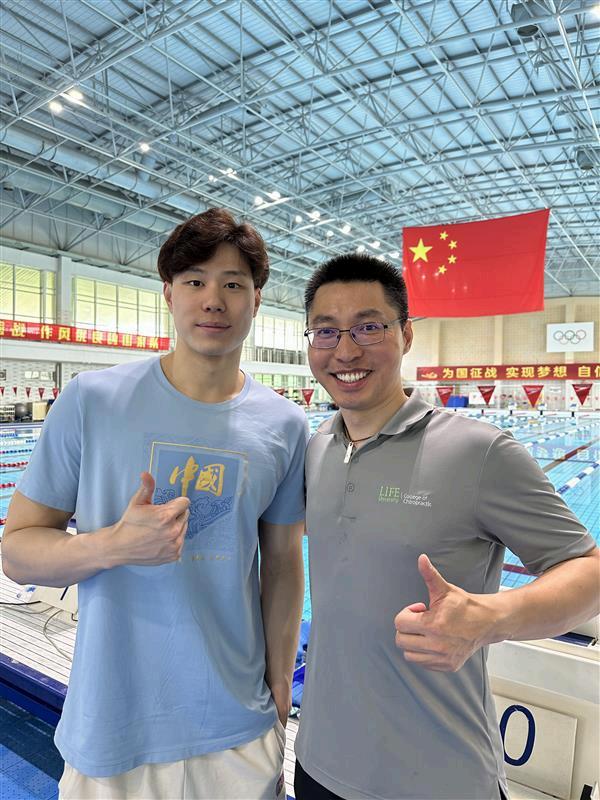 I graduated from Life University in 2012 with Doctor of Chiropractic and Master of Sports Chiropractic Degrees. I have been involved with the Chinese Olympic Committee for over 6 years representing chiropractors of Life University, as Life has had a collaborative agreement to provide chiropractic care to the Chinese Olympic Committee until 2022. It was a great honor to be with the Chinese Olympic delegation for the 2018 Asian Games for Rowing, Canoeing, and Kayaking. I also participated in the support team for the 2020 Tokyo Olympics for all sports and the 2022 Beijing Winter Olympics for Figure Skating and Speed Skating. This year, I covered Gymnastics, Trampoline, and Artistic Gymnastics during the 2024 Paris Olympics. Besides being available for any members of the team, I also provide care for a few individual athletes from different teams, including swimmers Yufei Zhang (pictured opposite), Haiyang Qin (pictured opposite), Jiajun Sun, and Jiayu Xu; race walker Hong Liu; long jumper Yuhao Shi; 3x3