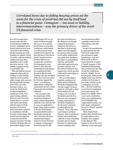 Fed-Treasury turf war, or maybe Geithner thought this was a way to protect the Fed from even greater restrictions, which indeed were then actively being considered in Congress. In his book Stress Test and in his Per Jacobsen lecture, Geithner fails to even mention this restriction. It is important to note, however, that when the Fed decided to help finance the acquisition by Bear Stearns in March 2008, Geithner, then the President of the New York Fed, asked for Treasury support for “cover”, so perhaps he believed that writing this requirement into law would help protect the Fed from criticism3. One can argue with the importance of this restriction, though it is clearly taking independent authority away from the Fed in a way not applicable to banks. Some point correctly to the fact that Paulson was generally Bernanke’s cheerleader during the crisis, but it has also been reported that Paulson refused to let the Fed lend to Lehman in September of 2008 because he did