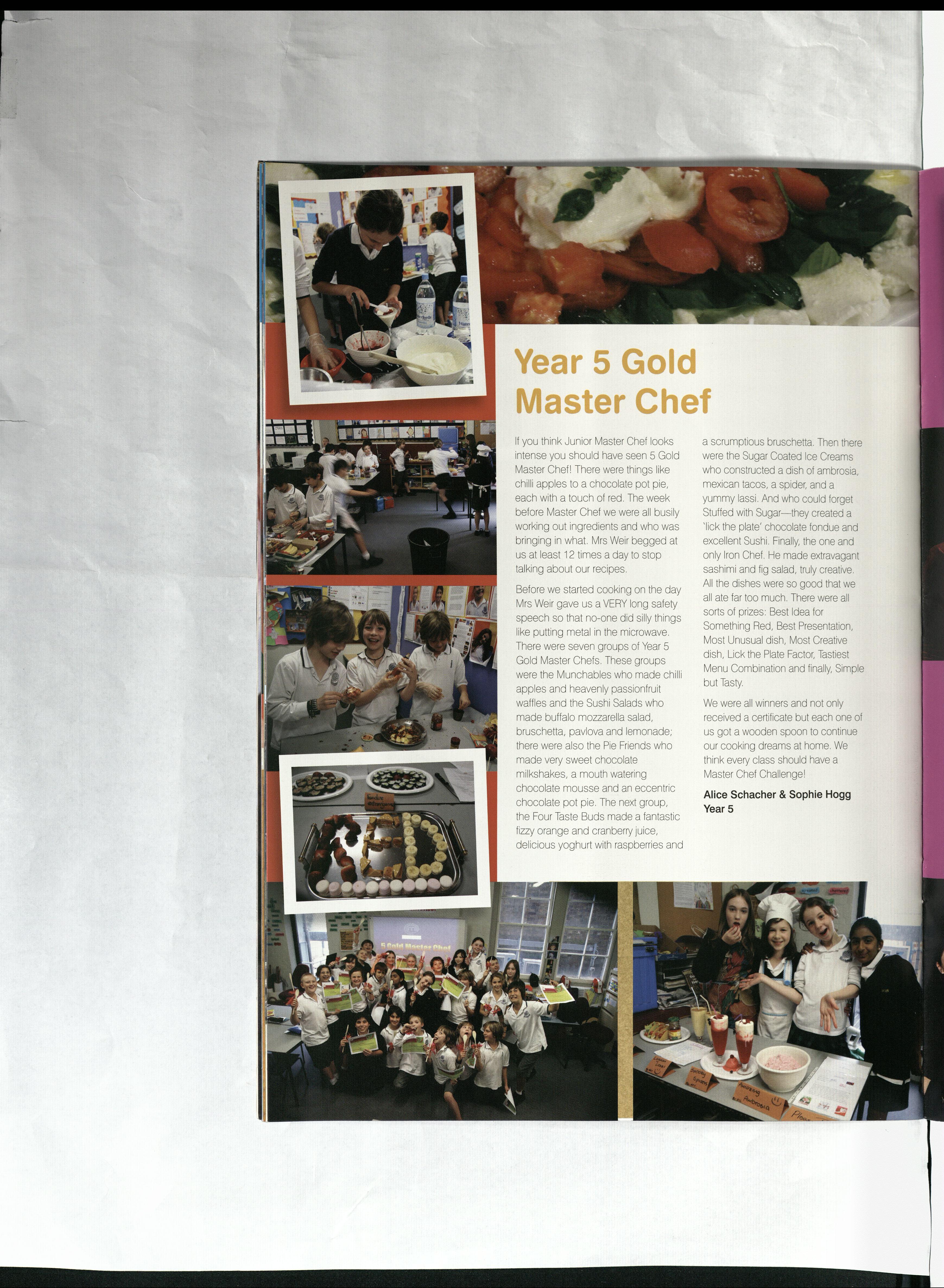 If you think Junior Master Chef looks intense you should have seen 5 Gold Master Chef I There were things like chilli apples to a chocolate pot pie, each with a touch of red. The week before Master Chef we were all busily working out ingredients and who was bringing in what Mrs Weir begged at us at least 12 times a day to stop talking about our recipes.