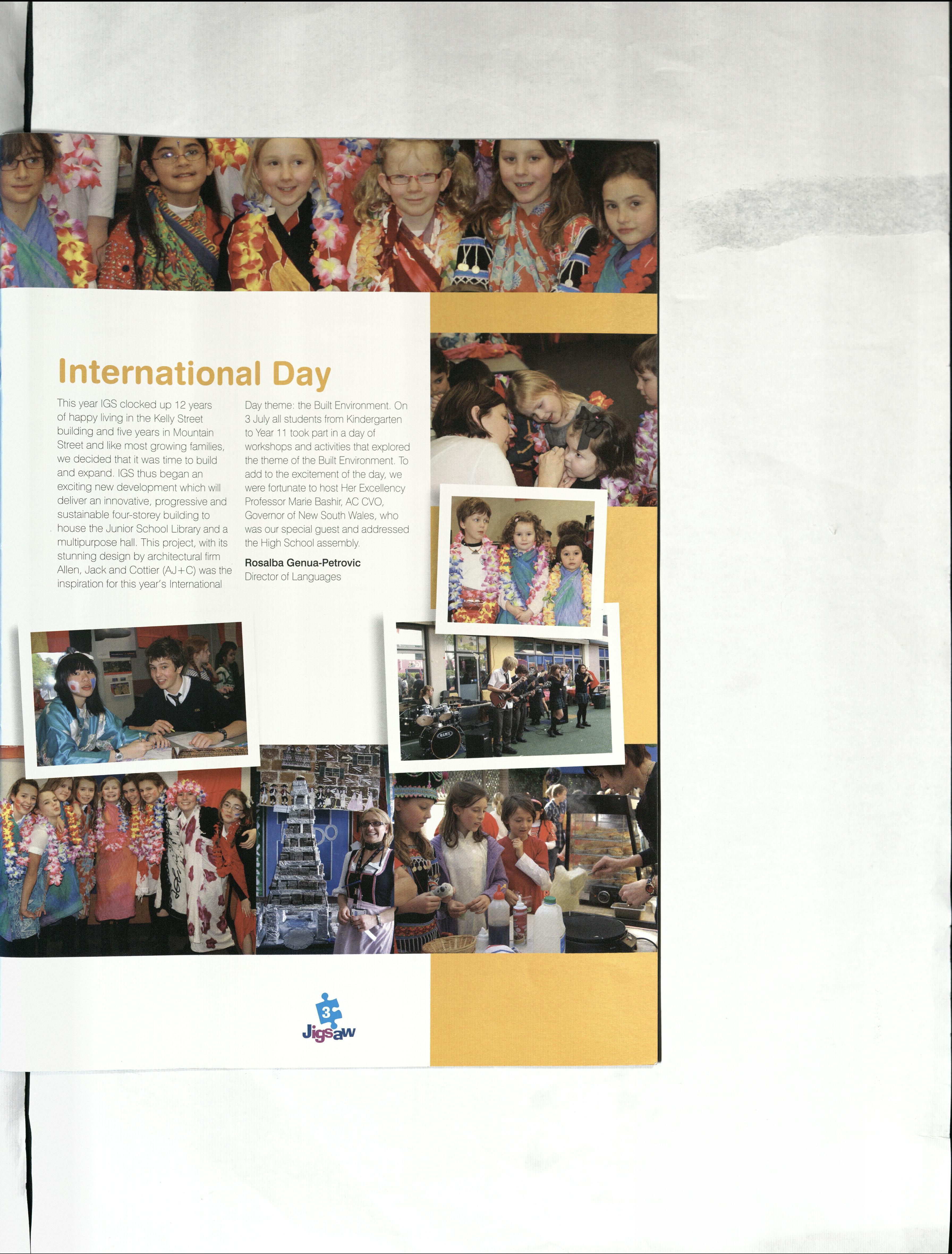 This year IGS clocked up 12 years of happy living in the Kelly Street building and five years in Mountain Street and like most growing families, we decided that it was time to build and expand. IGS thus began an exciting new development which will deliver an innovative, progressive and sustainable four-storey building to house the Junior School Library and a multipurpose hall. This project with its stunning design by architectural firm Allen, Jack and Cottier (AJ+C) was the inspiration for this year's International