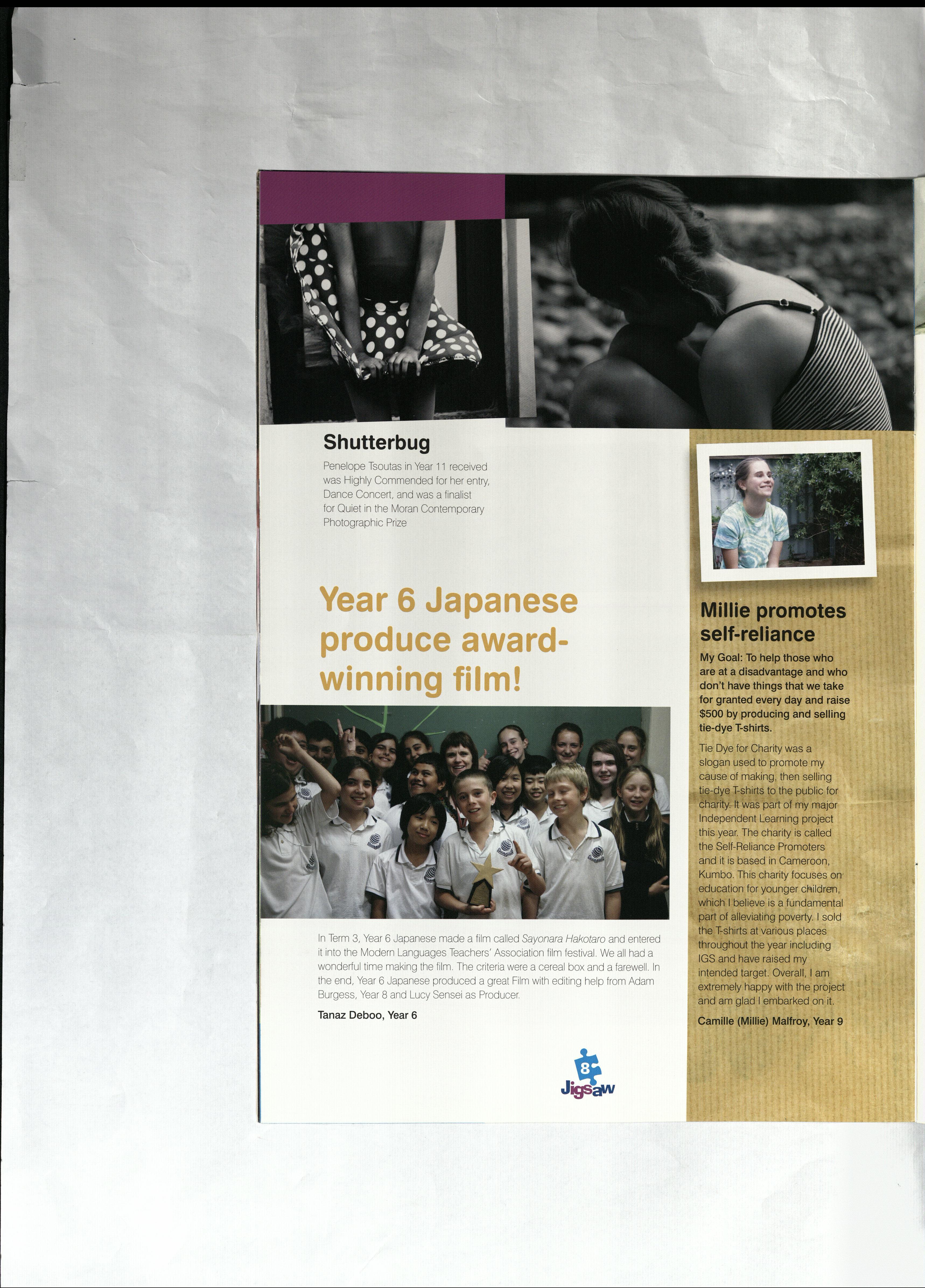 This Jigsaw, the last of 2010, marks the completion of my time as Principal of IGS. The photos in this Jigsaw beautifully reflect the School that I am so very proud of. They (the photographs) tell a story of students happy to be at school and fully engaged in the many activities available to them. Their lives are full of energy, joyful in their participation, noisy in their endeavours, but sincere and caring in the ir relationships. They are students who are pushing boundaries in creative expression, in film making, in music composition and performance, in drama production and acting, in design and visual expression