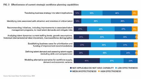One reason so many HR organisations were caught off guard by the Great Resignation trend of 2021 and 2022, was their inability to anticipate shifts in demand, supply of skills and changes in labor markets. Most respondents lack a wide range of effective strategic workforce planning capabilities. Only 6% believe their organisations are highly effective at identifying risks associated with talent attraction and retention. Fully 41% said they do not have capabilities for modeling alternative scenarios for workforce supply, demand and economic variance.