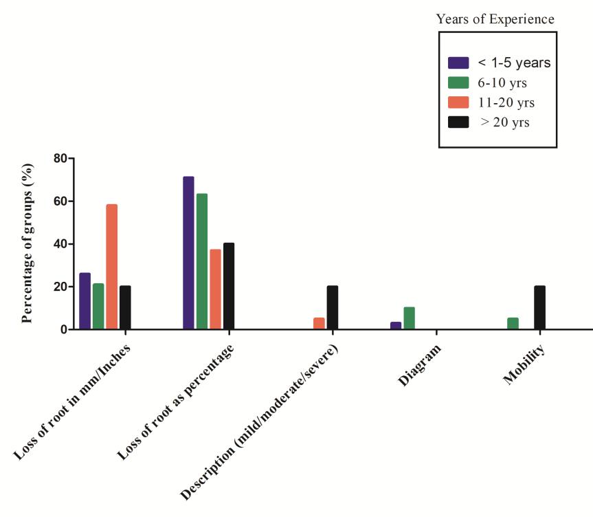In patients undergoing active orthodontic treatment with no initial risk of root resorption, most of the orthodontic specialists considered hypermobility as a clinical factor to determine whether OIERR was occurring. Literature shows that tooth mobility is a late sign of root resorption rather than an early indication.15,23 Therefore, this risk factor should be addressed with caution and only be considered as an indicator of advance root loss. In cases with more than 4mm root resorption during active treatment, orthodontists’ decision to compromise the treatment outcome and finish treatment promptly with use of light wire is in agreement with a recent systematic review showing positive association in risk and severity of OIERR with force magnitude, direction and treatment duration.15,23,24 Similarly in cases with risk of root resorption and remaining extraction spaces to be closed, most orthodontists in current study decided to interrupt the treatment and continue at later stages emphasizing the effect of treatment duration on the risk and severity of OIERR as well as the fact that OIERR reduces rapidly as treatment ceases. Regarding classification method to describe the severity of OIERR, orthodontists opt for “loss of root in percentage’’ similar to the approach used by Australian orthodontists. 15 Although different methods are available which differ I their use, literature supports all these methods and its more of an individual preference.21,22 OIERR is a multifactorial phenomenon, orthodontists were asked to make generalized decisions of an otherwise complex issue. This study was lacking regarding the effect of different mechanics used during orthodontic treatment on root resorption. 23 Regarding, post orthodontic retention protocol in patients with root resorption, orthodontists’ decision was fixed retention which is in accordance with previous studies.15,24