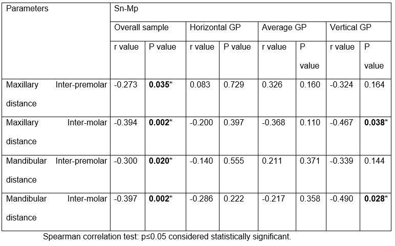 The significant negative correlations between the SN-MP angle and dental arch widths further support the influence of vertical facial growth on dental arch morphology. The SN-MP angle is a commonly used cephalometric measurement to assess mandibular plane inclination and vertical growth pattern. The findings of this study indicate that as the SN-MP angle increases,