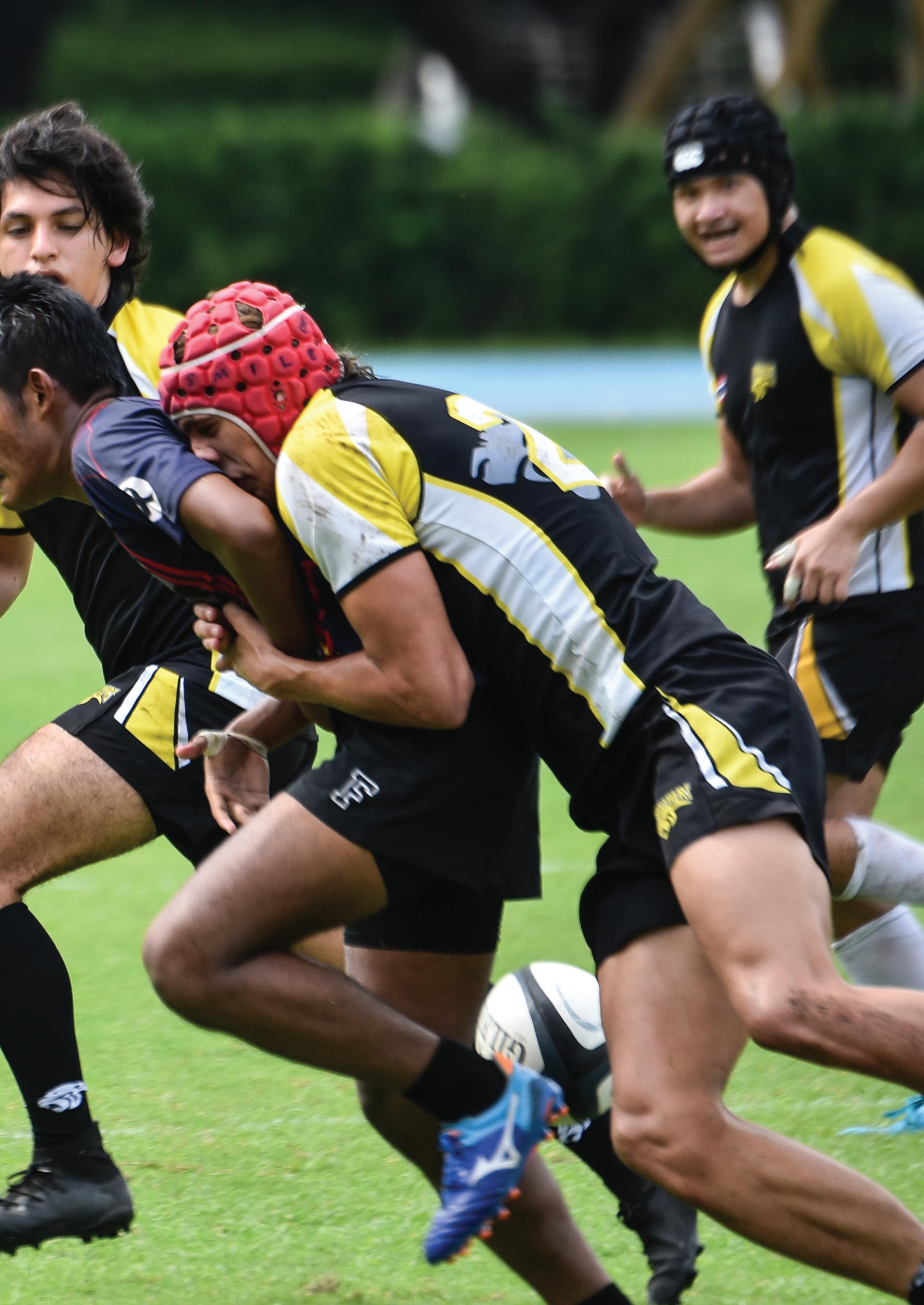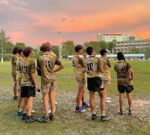 Members of the ISB U-15 Rugby team watch teammates on the field