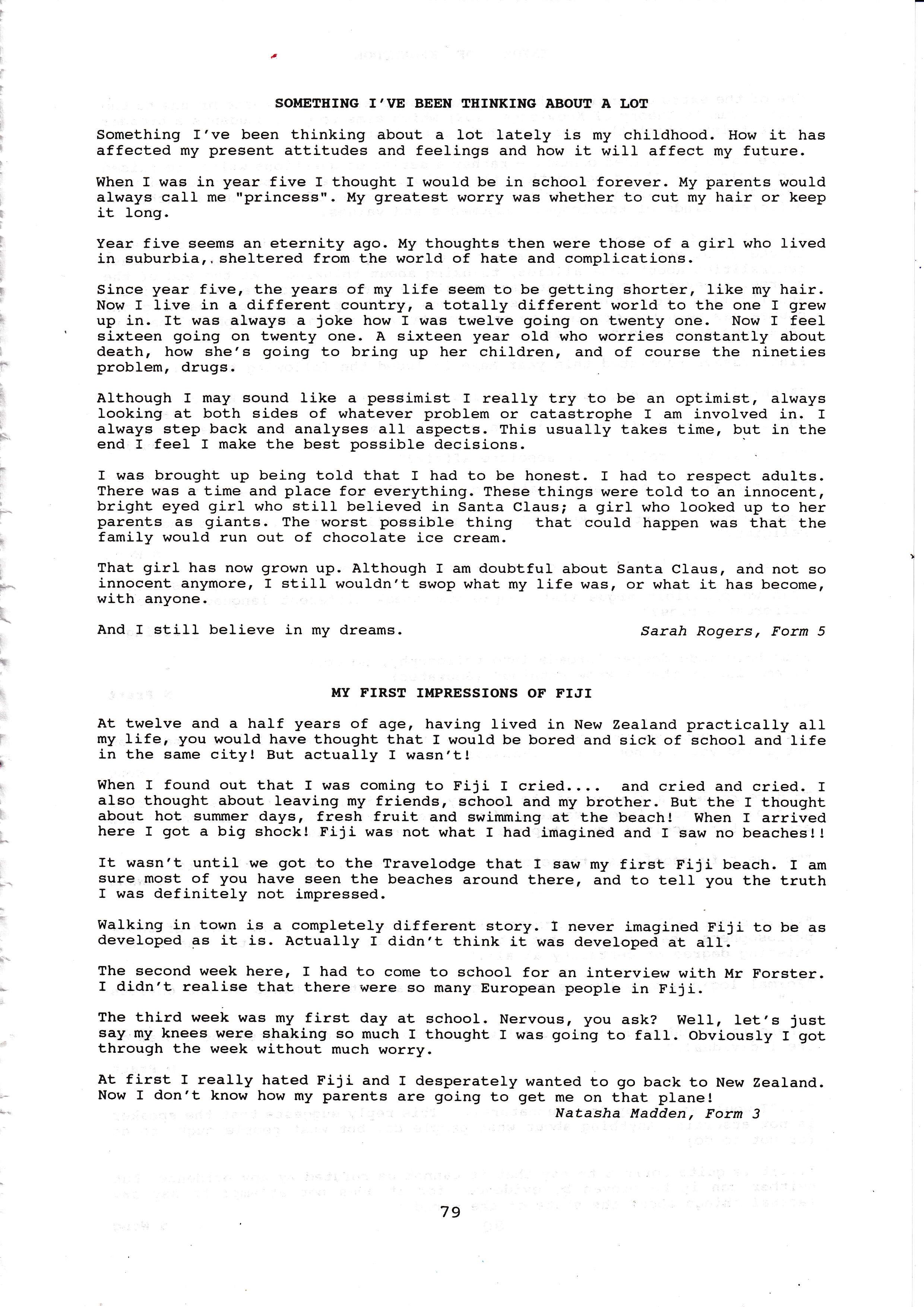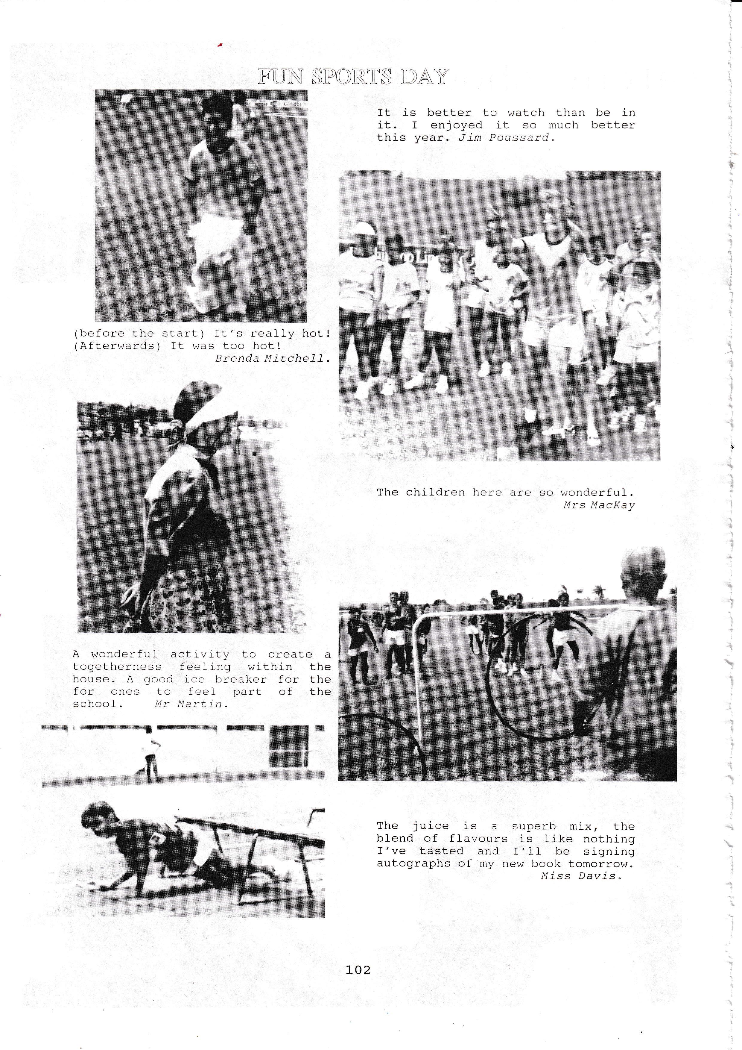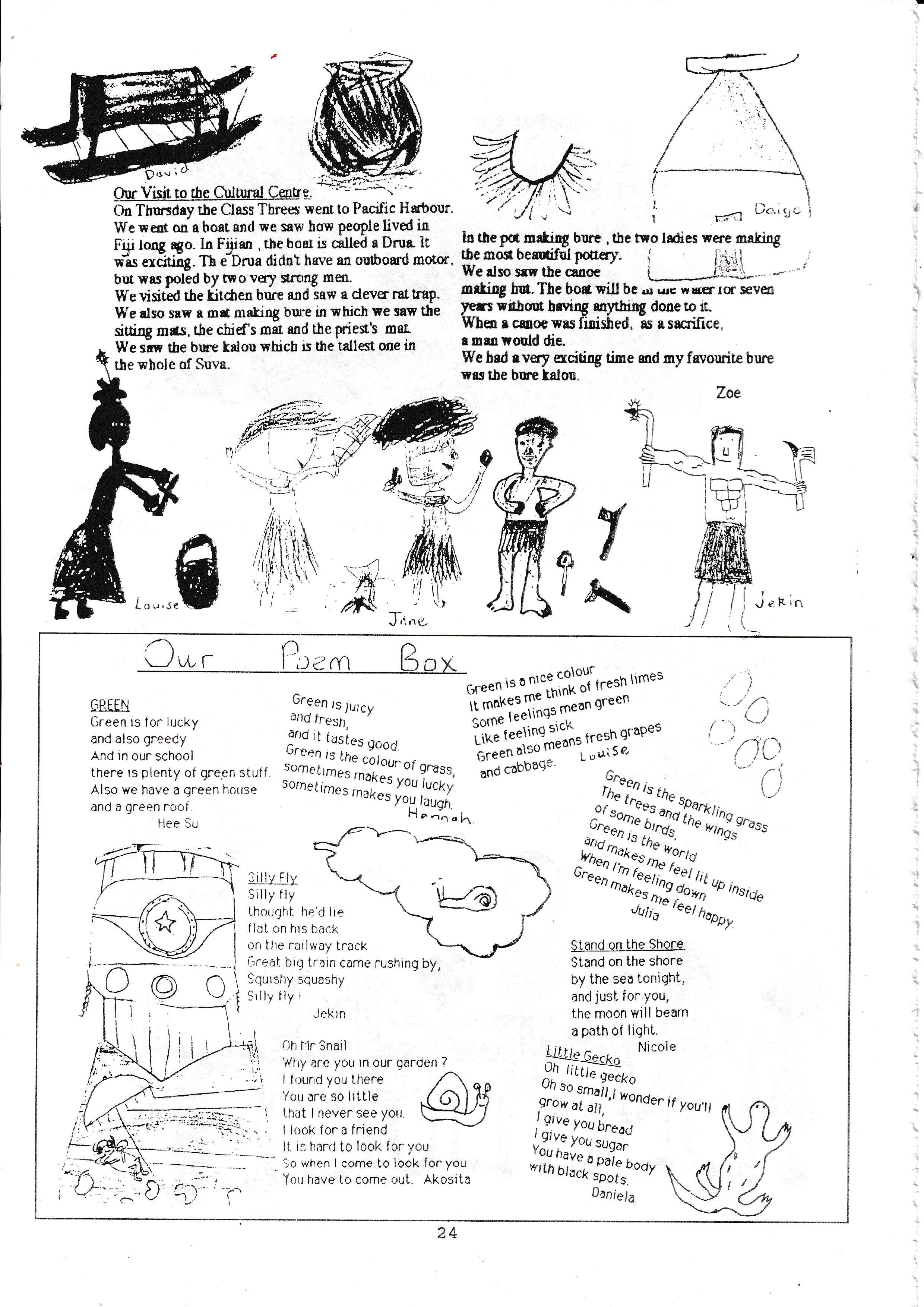 As in previous years teachers have been vigorous in exploring new ways in which to challenge students. Many local field trips have been undertaken to places of interest in the qreater Suva area. Excursions further afield included the class five trip to Lautoka and Vatukoula and the class six camp to Deuba. Our students have excelled in sports achieving good results in swimming and athletics, as well as many other codes. Music has been a feature of the prograrnme this year with most students becoming proficient in basic recorder playing and others sharinq with us their talents in piano, violin, guitar, panpj-pes and percussion. Budding writers have been successfur in -having original Mr Richard Thompson material published in "A Million stories by Primary students of Fiji" and Jessica Mcphee gained second place in an international art competition sponsored by the fonim shipping f,iie. our computer programme has developed well under the guidance of Mr Denize, with many staff and students showing exceptional taleni and aptitude for this medium. With a considerabLe investment ny the school in comp-uters we hope to begin expansion of the hardware into ciassrooms for widei application of skil Is