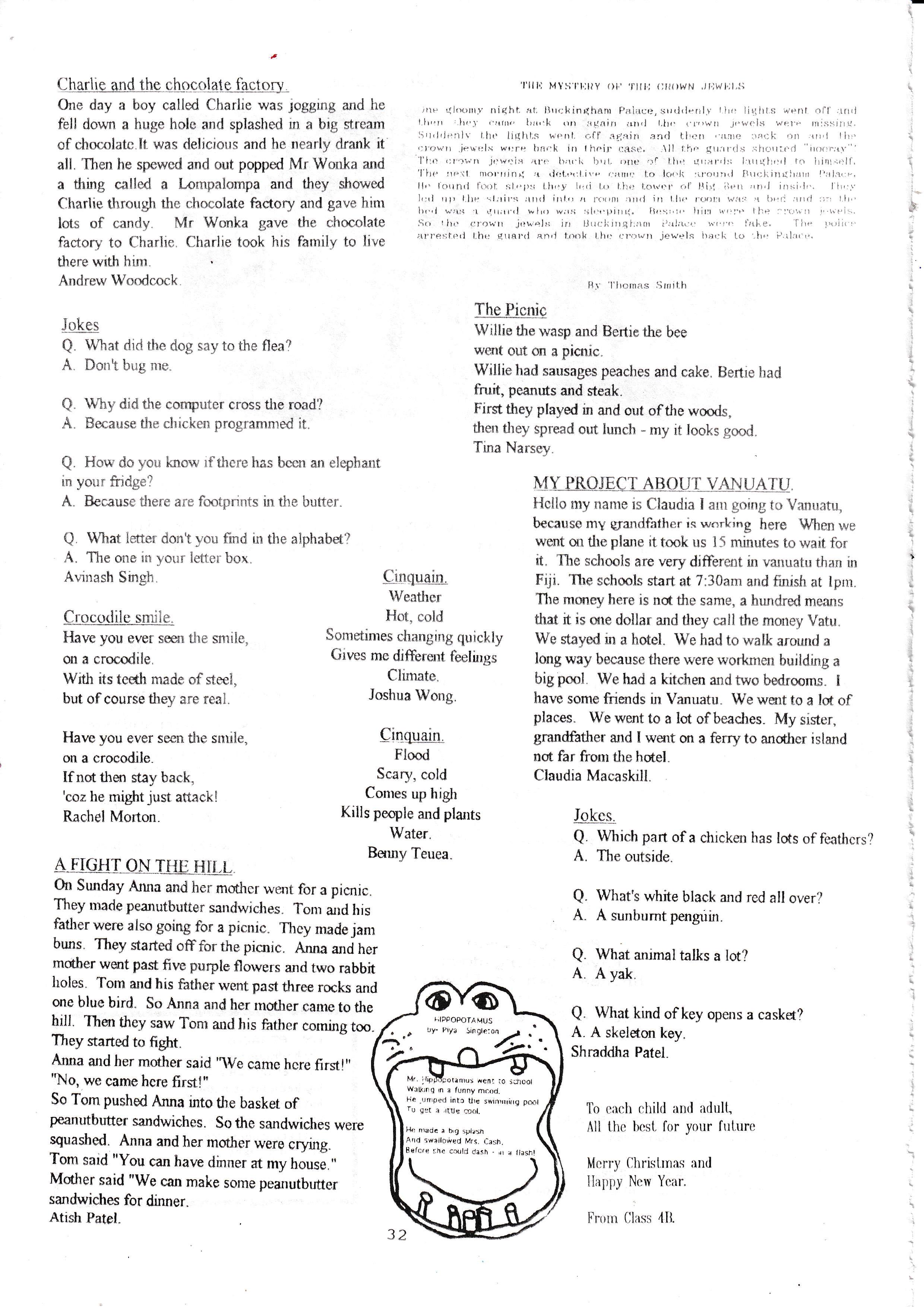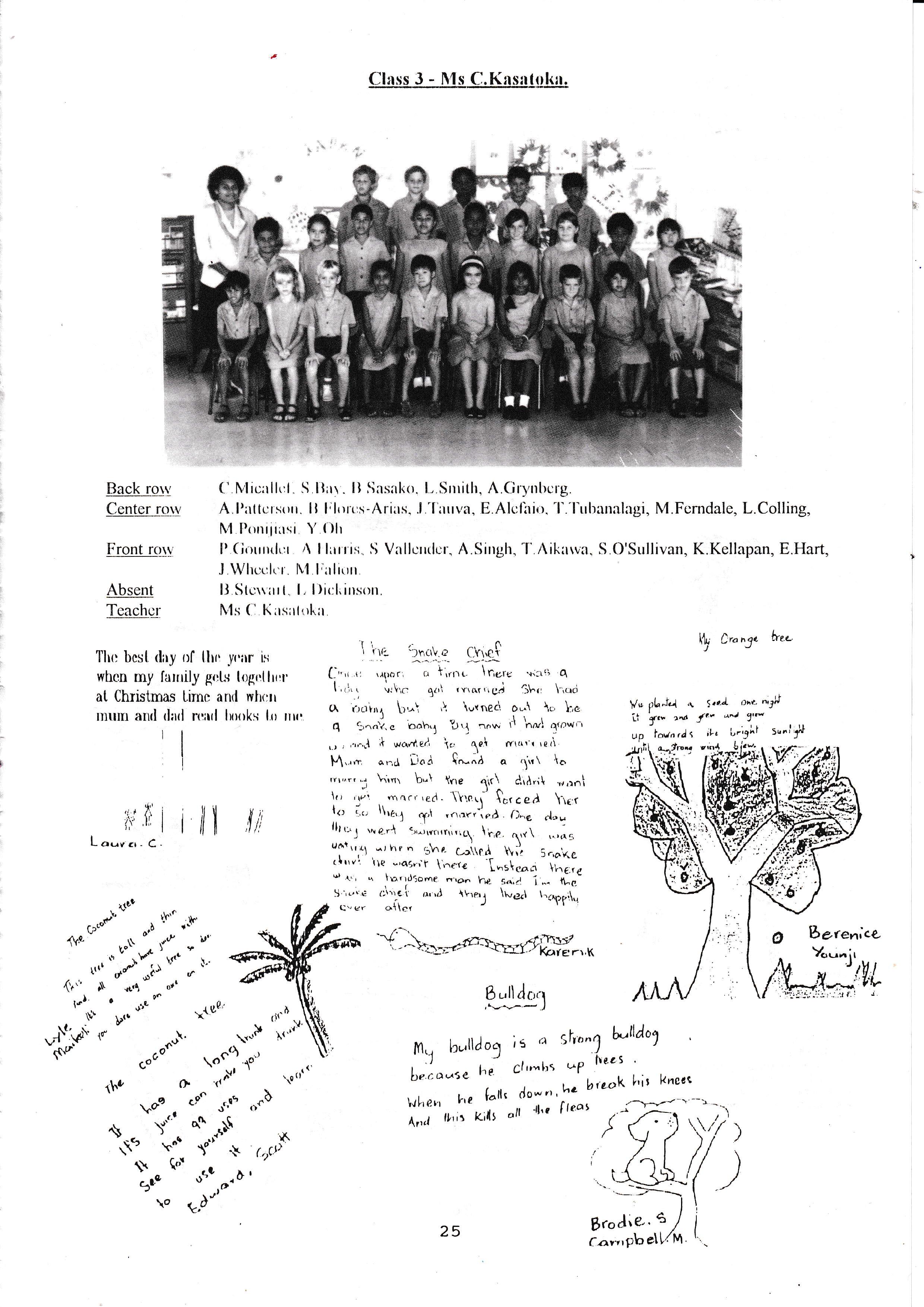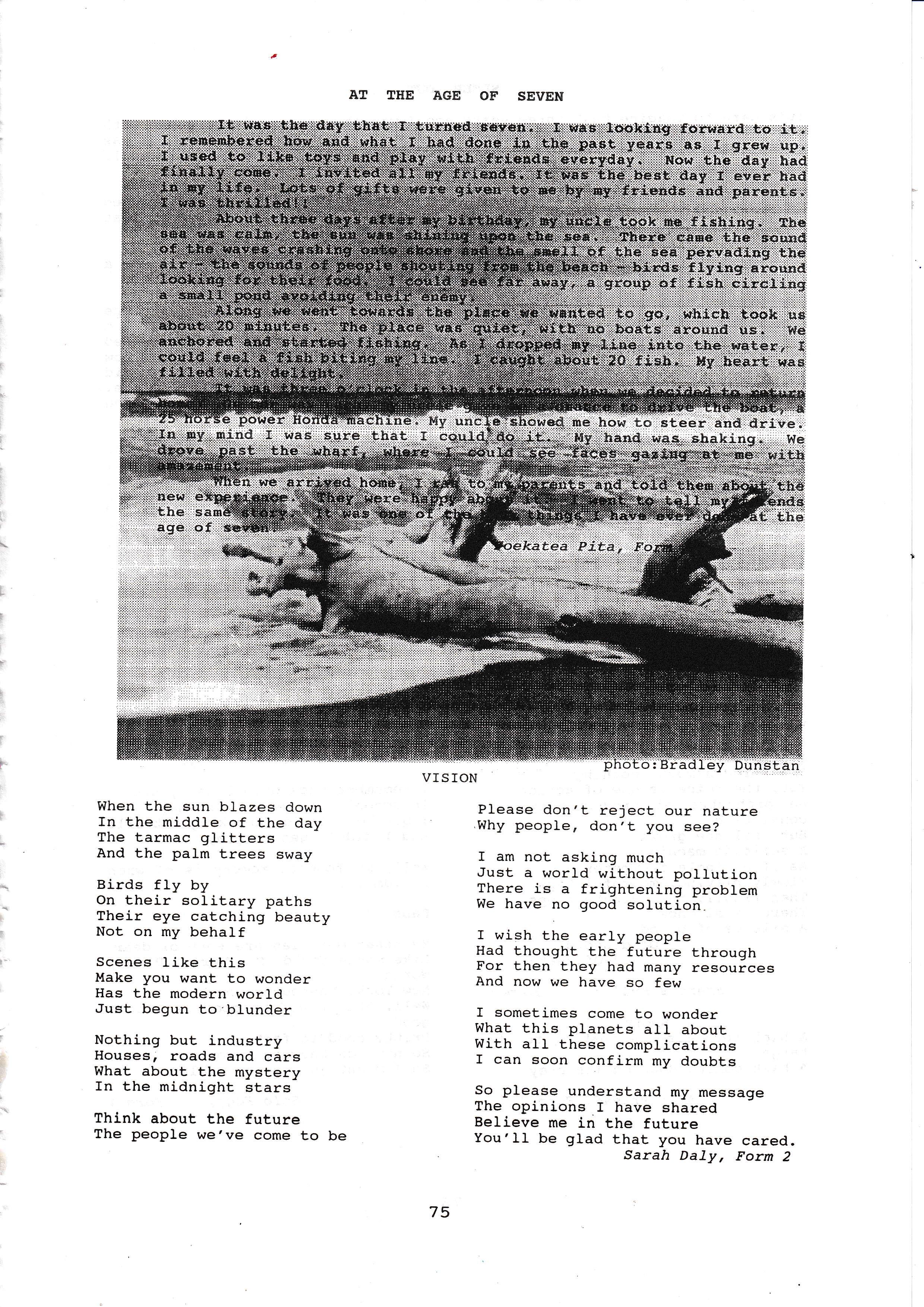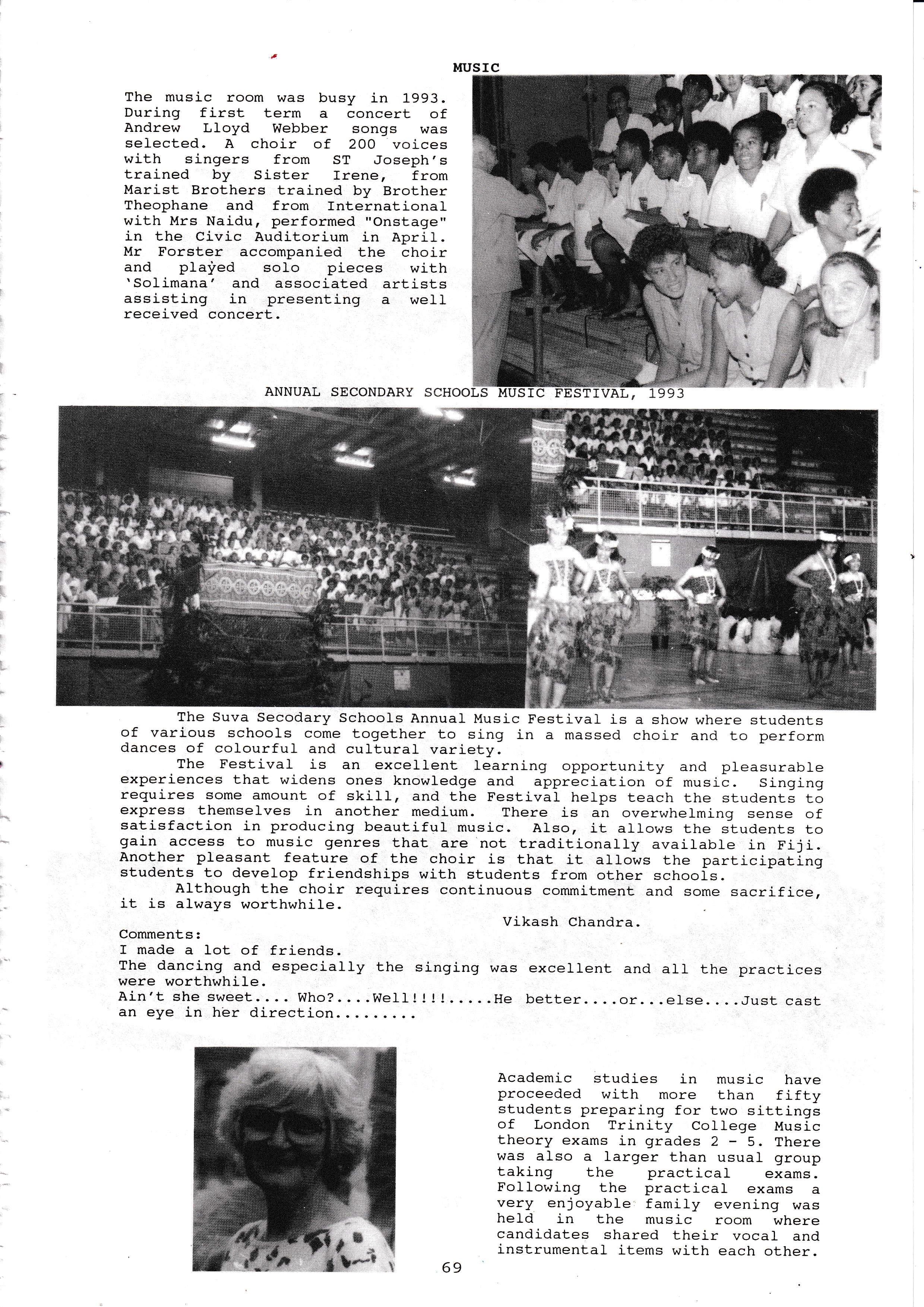 As in previous years teachers have been vigorous in exploring new ways in which to challenge students. Many local field trips have been undertaken to places of interest in the qreater Suva area. Excursions further afield included the class five trip to Lautoka and Vatukoula and the class six camp to Deuba. Our students have excelled in sports achieving good results in swimming and athletics, as well as many other codes. Music has been a feature of the prograrnme this year with most students becoming proficient in basic recorder playing and others sharinq with us their talents in piano, violin, guitar, panpj-pes and percussion. Budding writers have been successfur in -having original Mr Richard Thompson material published in "A Million stories by Primary students of Fiji" and Jessica Mcphee gained second place in an international art competition sponsored by the fonim shipping f,iie. our computer programme has developed well under the guidance of Mr Denize, with many staff and students showing exceptional taleni and aptitude for this medium. With a considerabLe investment ny the school in comp-uters we hope to begin expansion of the hardware into ciassrooms for widei application of skil Is