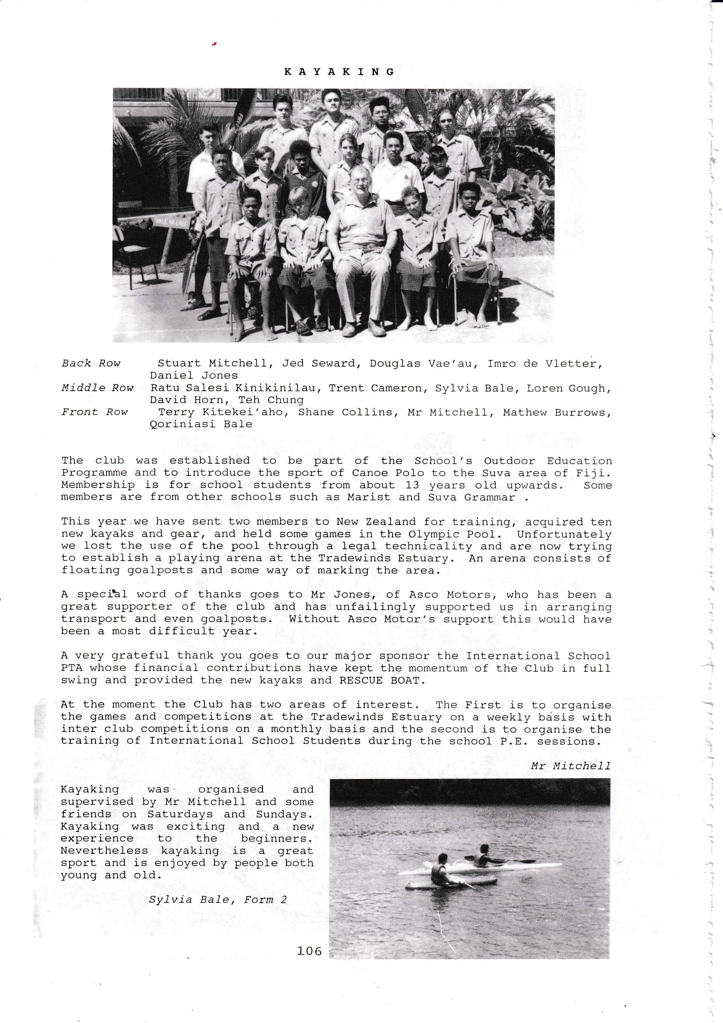 Kayaking was' orqanised and supervised by I4r Mitchell and some friends on Saturdays and Sundays. Kayaking was excitinq and a new experience to the beginners. Nevertheless kayaking is a great sport and is enloyed by people both young and old.