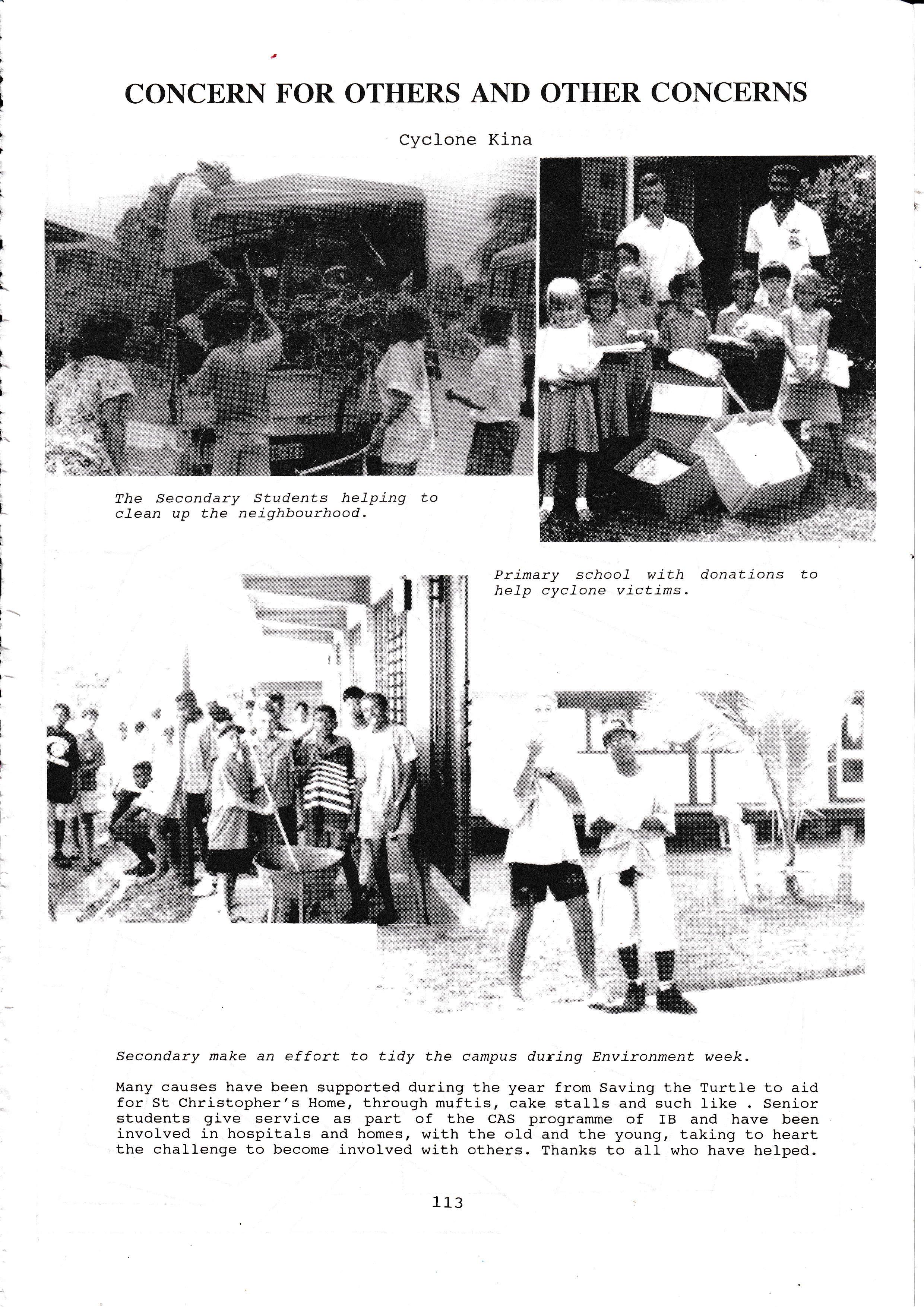 Secondary make an effort to tidy the campus during Environment week. Many causes have been supported during the year from Saving the Turtle to aid for St Christopher's Home, through muftis. cake stalls and such like Senior students give service as part of the CAS programme of IB and have been involved in hospitals and homes, with the old and the younlr, taking to heart the challenge to become involved with others. Thanks to all who have helped.