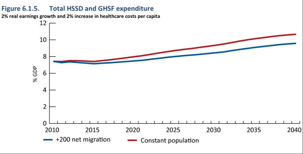 We reproduce one of the examples from the 2012 report Total healthcare costs were projected to rise by between 2 2% and 3 1% of GDP over the forecast period (2010 to 2040), given assumptions of economic growth of 2% and 2% healthcare inflation. This was not a forecast but a projection of the as is, as was then (in 2012), situation.