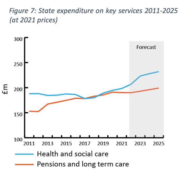 Demographics drive the two biggest long term upwards pressures on Guernsey's public sector costs. An ageing society means more pensioners, and those pensioners are tending to live longer and draw their pensions longer thus increasing cost. Society's ageing tendency also increases health and social care costs. An ageing population consumes more healthcare and social care