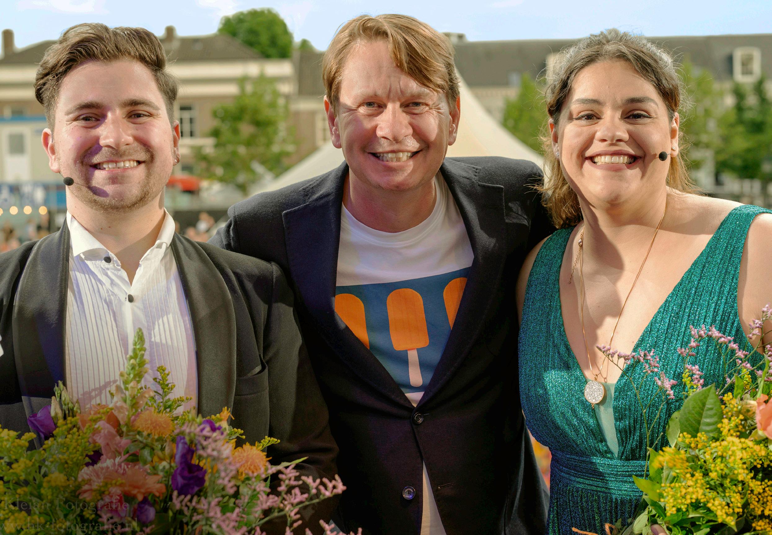 Scheidend algemeen directeur Ivan van Kalmthout met IVC-prijswinnaars Sílvia Sequeira en Anton Kuzenok op het operaconcert tijdens Opera op de Parade 2023.