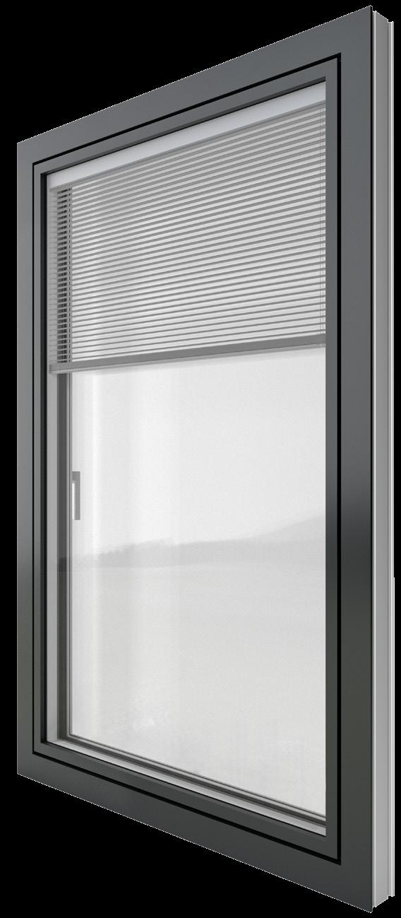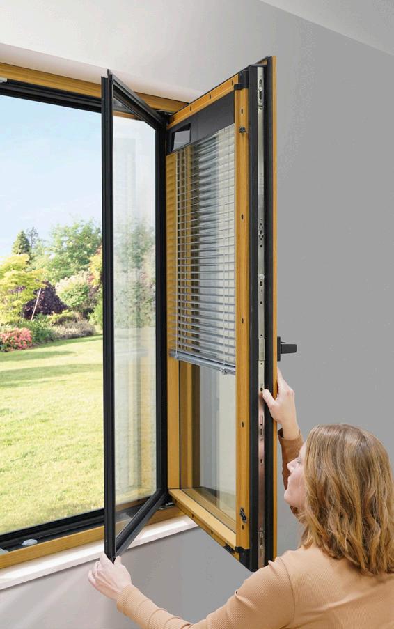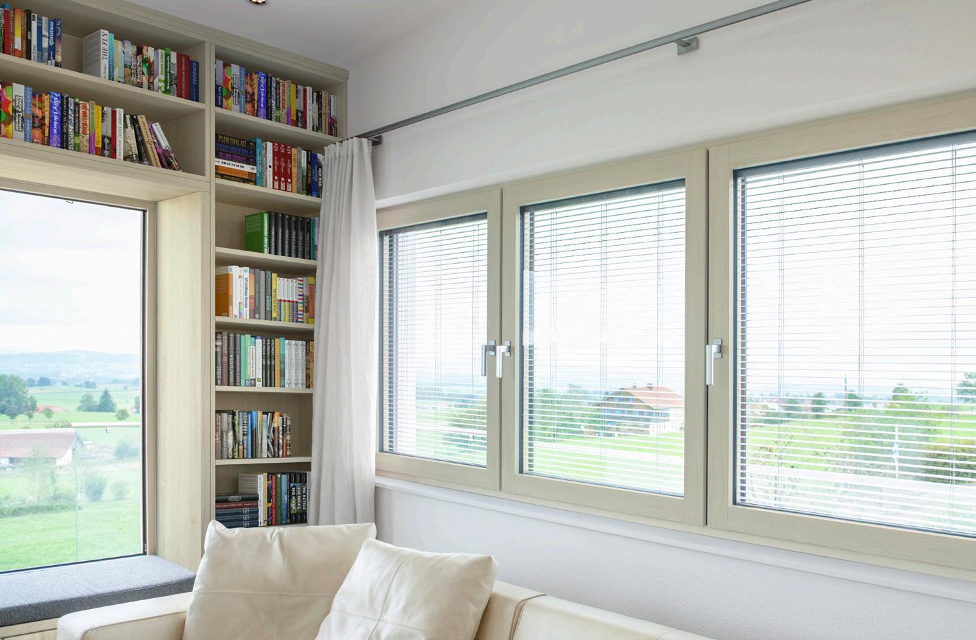 Verbundfenster: integrierter Sonnen- und Sichtschutz zwischen den Scheiben – wahlweise Jalousie, Faltstore oder Duette ®, auf Wunsch mit energieautarkem Sonnenschutz (I-tec Shading).
