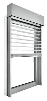 Vorsatz-Raffstore: optimale Steuerung und Lenkung von Licht und Wärme durch verstellbare Lamellen; mit Insektenschutz kombinierbar.