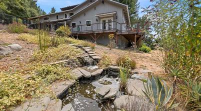Nestled on a 2.46-acre lot, this architecturally stunning retreat blends country charm with modern luxury, just minutes from Downtown Los Gatos. Enter through striking double doors into a travertine-tiled foyer, leading to a family room with vaulted wood-inlay ceilings, hardwood floors, and expansive forest views. The high-end epicurean kitchen showcases JennAir appliances, maple cabinetry, granite counters, and a breakfast bar including a prep sink and an induction fondue cooktop. The home features 4 bedrooms, a dedicated den, and a versatile loft (5th bedroom/craft room). The primary suite offers vaulted ceilings, a gas fireplace, dual walk-in closets, private deck, and a modern spa-like bathroom with radiant floors, floating vanities, and a steam shower. Smart amenities include triple-zone NEST climate control, Sonos-controlled speakers, owned solar, a tankless & a solar water heater, and a private well. Enjoy a finished 3-car garage and a climate-controlled gym. Multiple decks invite relaxation, while a gazebo-covered hot tub sits beside a cascading waterfall and serene lily-pad pond. A pellet stove-warmed barn/workshop welcomes year-round projects. Served by top schools, including Los Gatos High, this retreat offers nature, technology, and craftsmanship in perfect harmony.