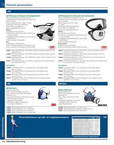 Norm: EN 405:2002 NPF: 50 (met uitzondering van 5174) Materiaal: PP Gas-, damp- en stofmasker uit één geheel • In gesloten verpakking te bewaren tot aangegeven datum, na openen beperkte gebruiksduur