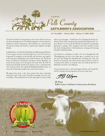 Well, it looks like we made it through another Florida “Winter.” We welcome the Spring on March 20 with green grasses and highto cattle Asbeen I’m awriting letter, am It’s hard believe prices. it’s almost year sincethis I first wroteI one reflecting on how good it is to be in the cattle business of these messages for In The Field magazine. It’s very hard to and how thankful I am to get to work with such a good believe of it’speople. almost Christmas. The holidays are a special time group