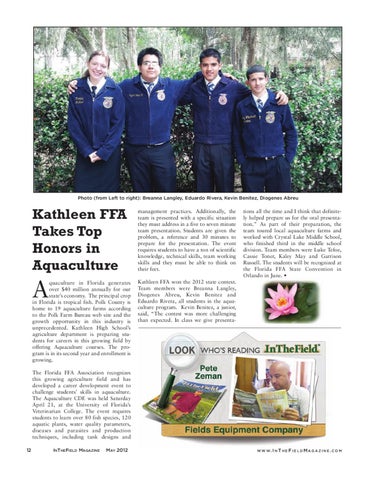 Kathleen FFA won the 2012 state contest. Team members were Breanna Langley, Diogenes Abreu, Kevin Benitez and Eduardo Rivera, all students in the aquaculture program. Kevin Benitez, a junior, said, “The contest was more challenging than expected. In class we give presenta-