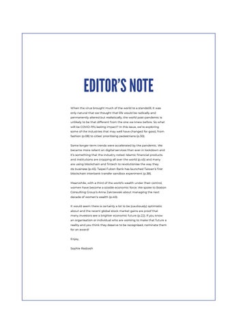EDITOR’S NOTE When the virus brought much of the world to a standstill, it was only natural that we thought that life would be radically and permanently altered but realistically, the world post-pandemic is unlikely to be that different from the one we knew before. So what will be COVID-19’s lasting impact? In this issue, we’re exploring some of the industries that may well have changed for good, from fashion (p.08) to cities’ prioritising pedestrians (p.30). Some longer-term trends were accelerated by the pandemic. We became more reliant on digital services than ever in lockdown and it’s something that the industry noted. Islamic financial products and institutions are cropping all over the world (p.45) and many are using blockchain and fintech to revolutionise the way they do business (p.45). Taipei Fubon Bank has launched Taiwan’s first blockchain interbank transfer sandbox experiment (p.38). Meanwhile, with a third of the world’s wealth under their control, women have become a sizable economic force. We spoke to Boston Consulting Group’s Anna Zakrzewski about managing the next decade of women’s wealth (p.40). It would seem there is certainly a lot to be (cautiously) optimistic about and the recent global stock market gains are proof that many investors see a brighter economic future (p.22). If you know an organisation or individual who are working to make that future a reality and you think they deserve to be recognised, nominate them for an award! Enjoy, Sophie Rasbash