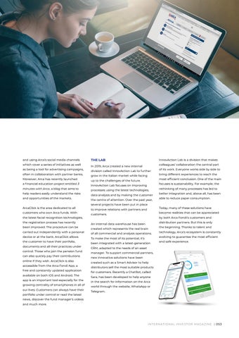 CRM, adapted to the needs of an asset manager. To support commercial partners, new innovative solutions have been created such as a Smart Advisor to help distributors sell the most suitable products for customers. Recently a ChatBot, called Sara, has been developed to help anyone in the search for information on the Arca world through the website, WhatsApp or Telegram.
