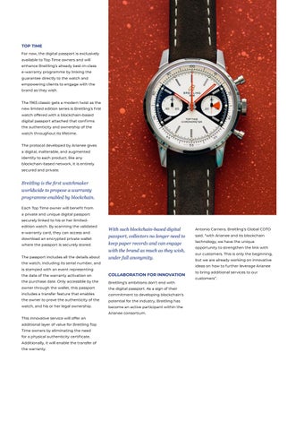 Breitling is the first watchmaker worldwide to propose a warranty programme enabled by blockchain. Each Top Time owner will benefit f rom a private and unique digital passport securely linked to his or her limitededition watch. By scanning the validated e-warranty card, they can access and download an encrypted private wallet where the passport is securely stored.