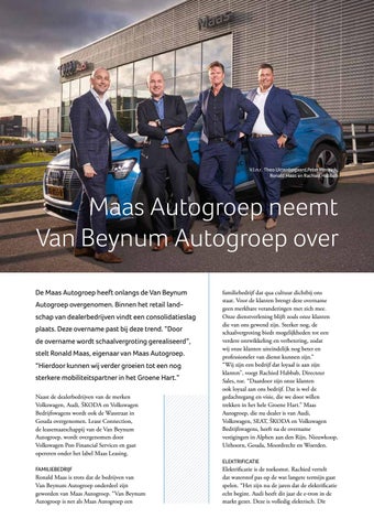 familiebedrijf dat qua cultuur dichtbij ons staat. Voor de klanten brengt deze overname geen merkbare veranderingen met zich mee. Onze dienstverlening blijft zoals onze klanten die van ons gewend zijn. Sterker nog, de schaalvergroting biedt mogelijkheden tot een verdere ontwikkeling en verbetering, zodat wij onze klanten uiteindelijk nog beter en professioneler van dienst kunnen zijn.” “Wij zijn een bedrijf dat loyaal is aan zijn klanten”, voegt Rachied Habbab, Directeur Sales, toe. “Daardoor zijn onze klanten ook loyaal aan ons bedrijf. Dat is wel de gedachtegang en visie, die we door willen trekken in het hele Groene Hart.” Maas Autogroep, die nu dealer is van Audi, Volkswagen, SEAT, ŠKODA en Volkswagen Bedrijfswagens, heeft na de overname vestigingen in Alphen aan den Rijn, Nieuwkoop, Uithoorn, Gouda, Moordrecht en Woerden. ELEKTRIFICATIE