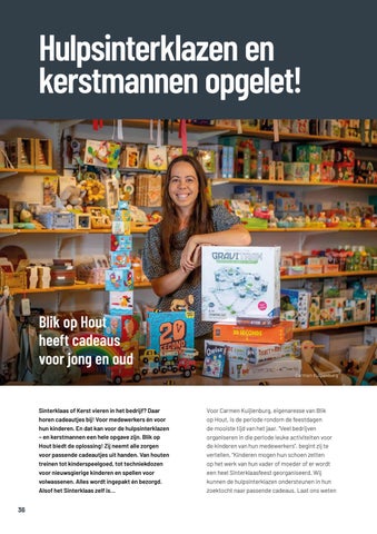 Voor Carmen Kuijlenburg, eigenaresse van Blik op Hout, is de periode rondom de feestdagen de mooiste tijd van het jaar. “Veel bedrijven organiseren in die periode leuke activiteiten voor de kinderen van hun medewerkers’’, begint zij te vertellen. “Kinderen mogen hun schoen zetten op het werk van hun vader of moeder of er wordt een heel Sinterklaasfeest georganiseerd. Wij kunnen de hulpsinterklazen ondersteunen in hun zoektocht naar passende cadeaus. Laat ons weten
