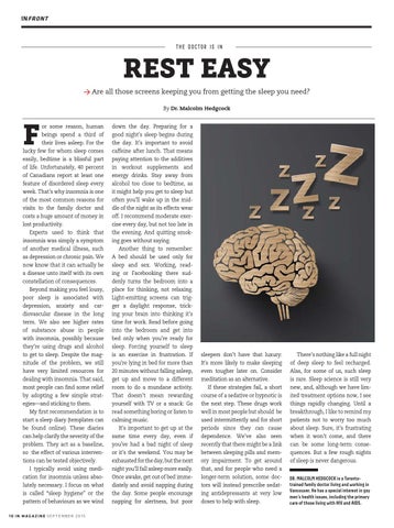 There’s nothing like a full night of deep sleep to feel recharged. Alas, for some of us, such sleep is rare. Sleep science is still very new, and, although we have lim ited treatment options now, I see things rapidly changing. Until a breakthrough, I like to remind my patients not to worry too much about sleep. Sure, it’s frustrating when it won’t come, and there can be some long-term conse quences. But a few rough nights of sleep is never dangerous. Dr. Malcolm Hedgcock is a Torontotrained family doctor living and working in Vancouver. He has a special interest in gay men’s health issues, including the primary care of those living with HIV and AIDS.