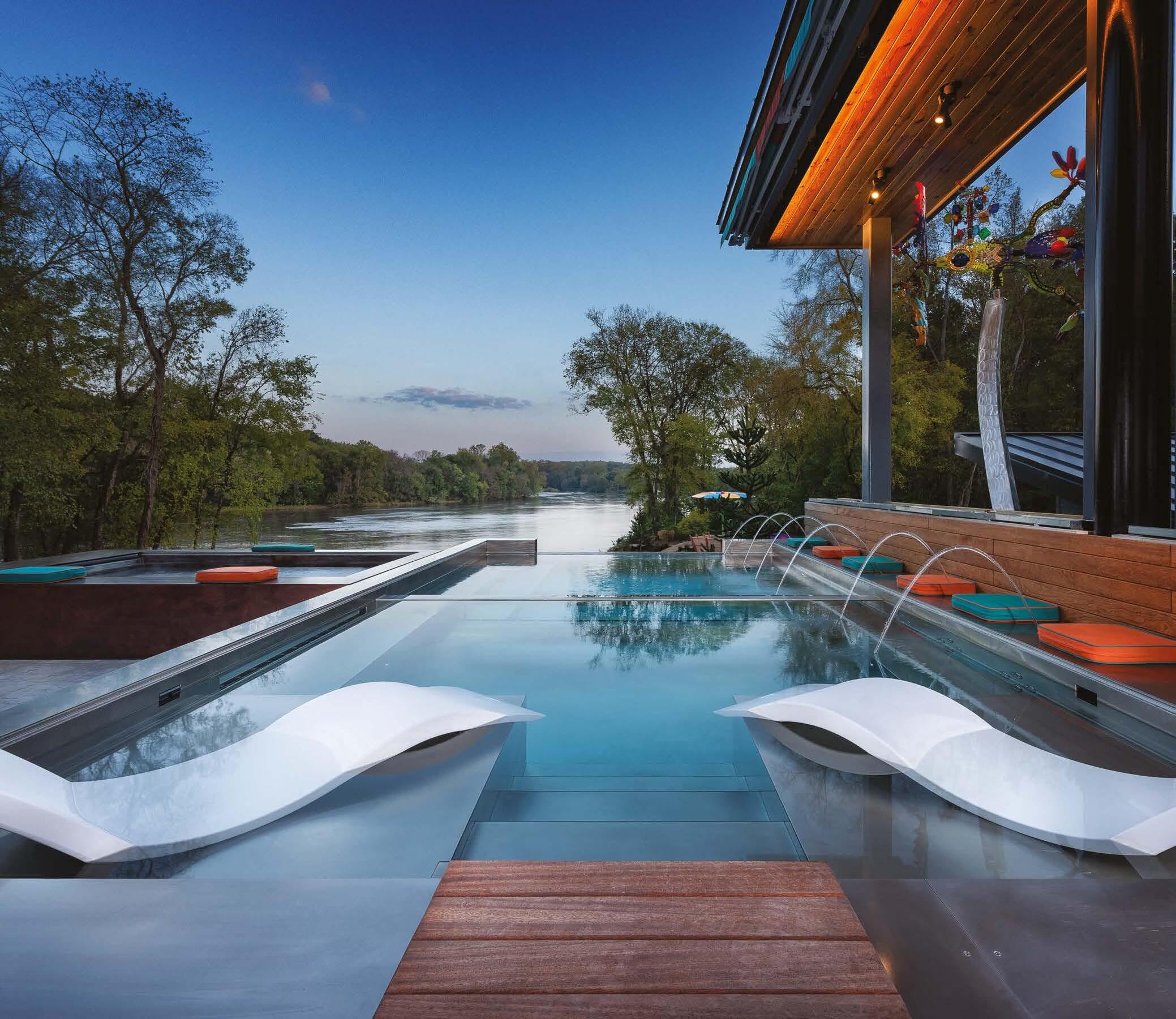 CUSTOM STAINLESS STEEL POOL WITH SUN SHELF, DESCENDING STAIRWAY, BENCH SEATING & LAMINAR JETS. GLASS WINDOWS SEPARATE POOL & NEIGHBORING STAINLESS STEEL & COPPER SPAS WITH VANISHING FRONT EDGE WATER FEATURE.
