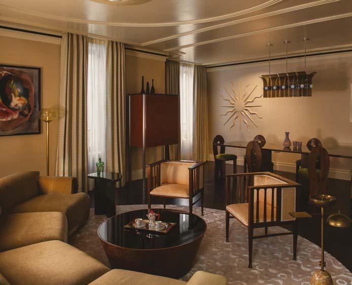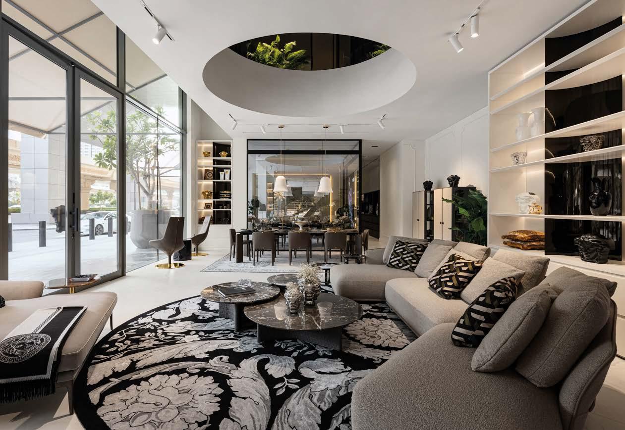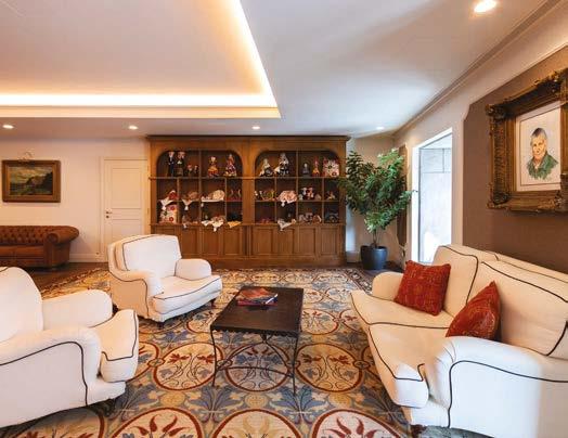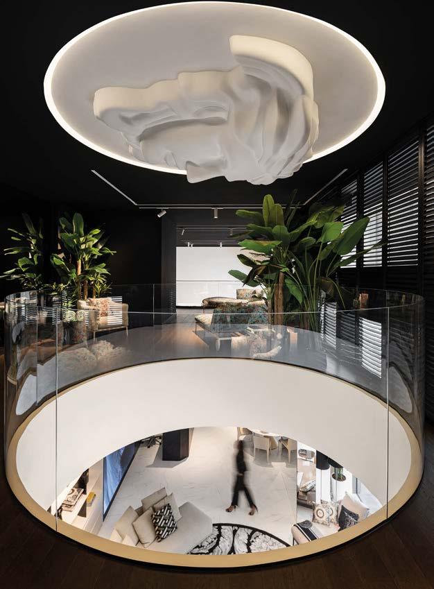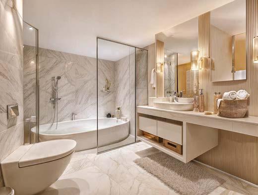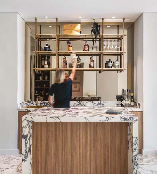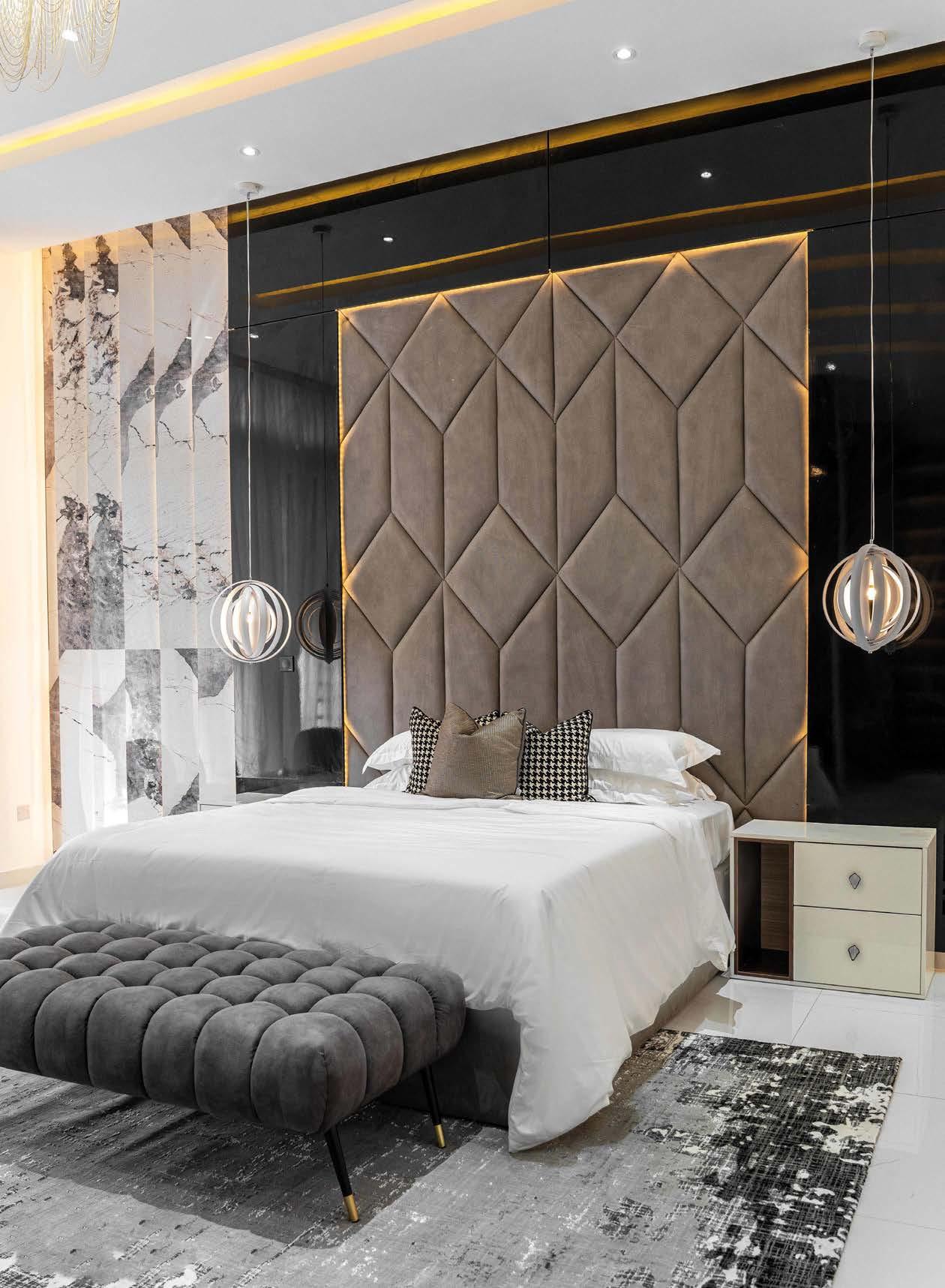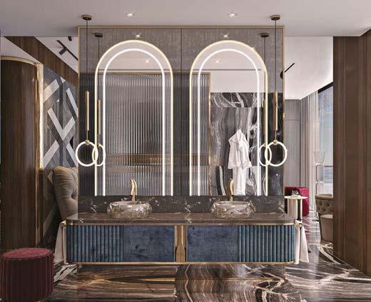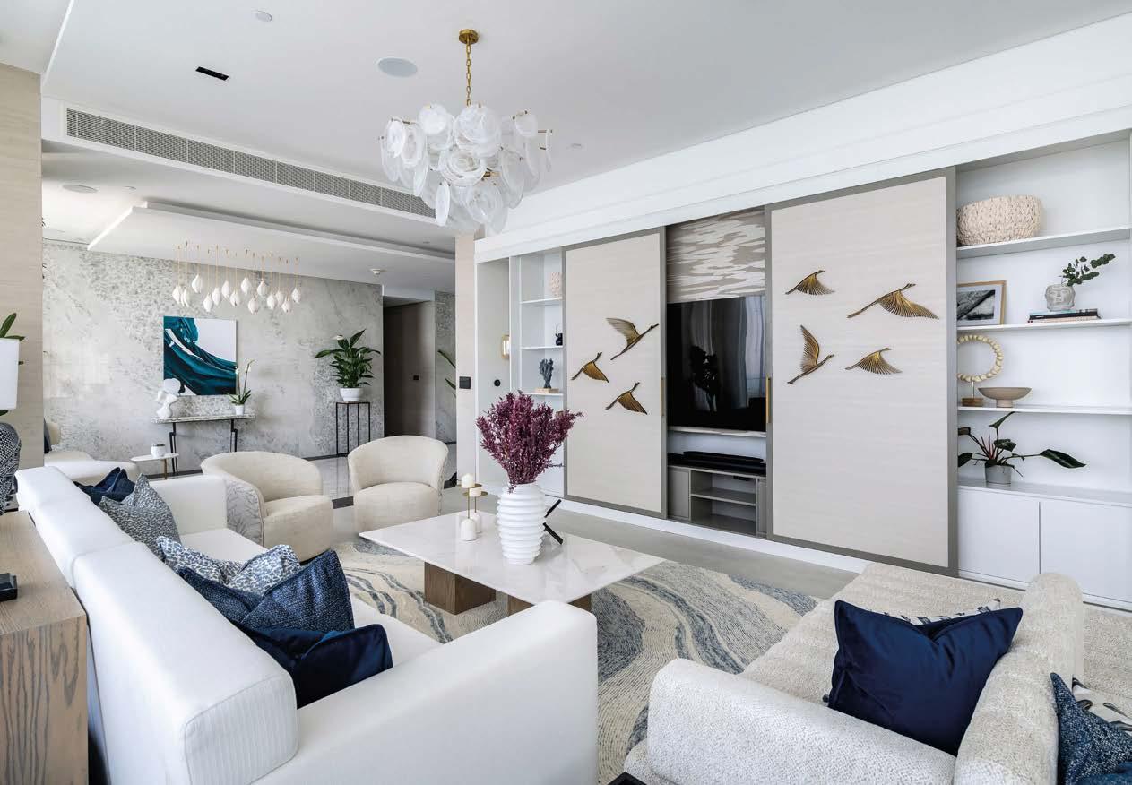 study and entertainment spaces, elevated with dramatic custom oak veneer panels with brass detailing, floor-to-ceiling mirrors, and harmonised textures. A bespoke recycled glass chandelier from the Czech Republic was installed as a dramatic centrepoint, illuminated by a meticulously designed lighting scheme. The study was transformed into a functional work space complete with infrared sauna and meditation area, while the maid’s room was reconfigured for practical back-of-house use.