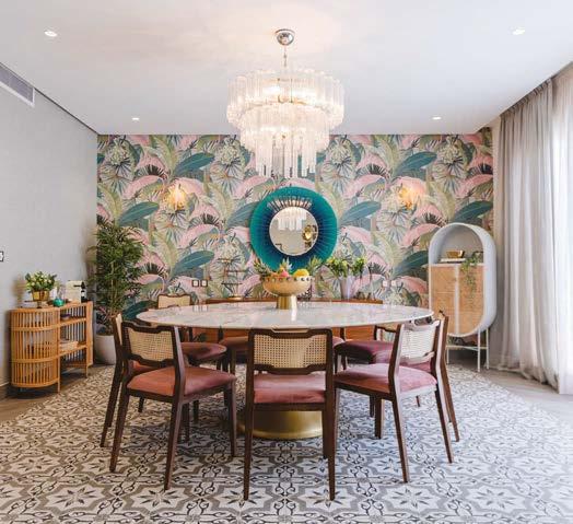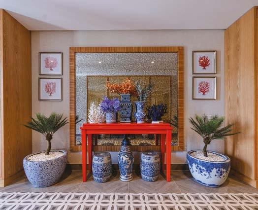 vibe, tropical cushions and cannage screens were used, along with Mediterranean-style cement tiles inspired by Syrian and Lebanese homes. A red console symbolises the Red Sea, and Mashrabiya woodwork reflects local architectural traditions. Blue chinoiserie jars, common in traditional Damascus homes, add a contrasting touch.