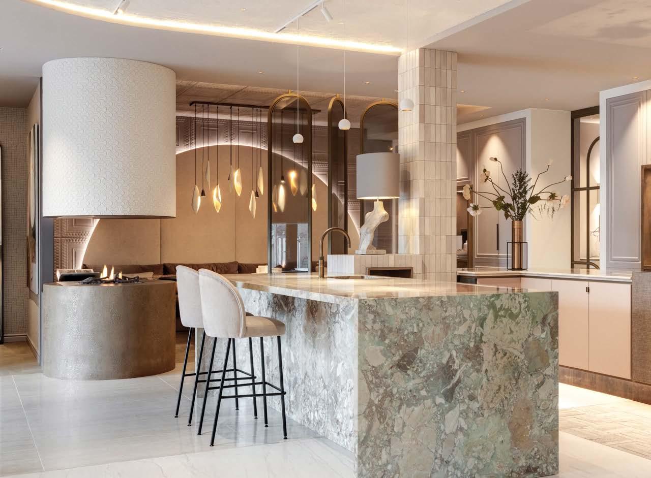 The upper penthouse level saw the main bathroom remodelled into a luxurious marble-clad, spa-like sanctuary with a standalone bath, jacuzzi, and double shower. Space was optimised by converting underused areas into storage solutions. A fully equipped marble bar speaks to the luxurious nature of Penthouse living.
