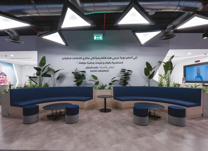 Building on the theme of integrating cultural identity with functionality, the Aseer Investment Company’s (AIC) office project in KAFD drew inspiration from Aseer’s natural beauty and heritage. Traditional motifs were incorporated into stucco-covered columns, while teak wood finishes reflected the style of old Aseer homes. The office accommodated 100 workstations with open-plan areas, executive offices, meeting rooms, and breakout