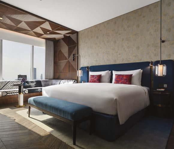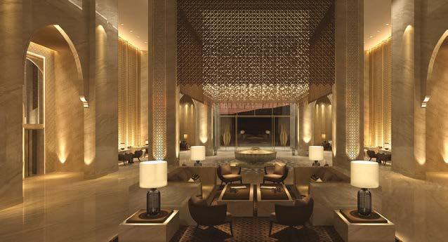 The hotel’s aesthetic relies on a restrained yet impactful colour palette. Black, white, and neutral tones form the base, while accents of rich blue add depth and vibrancy. This approach creates a balance between tranquillity and dynamism, mirroring the interplay of nature and the bustling city. A standout feature is the lighting design, which combines traditional glass-making techniques with modern craftsmanship. The inclusion of Bohemian crystal adds timelessness, lending the interiors a warm, inviting glow that echoes the natural beauty of the desert.