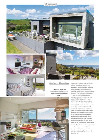 sweep of the Kinsale coastline and the Sovereign Islands beyond, the focal point of the house is the flowing reception rooms. There are four double bedrooms, including a generous master suite, with a signature en suite. There is a small harbour at Sandycove, where residents are exclusively allowed a private mooring in the estuary. Today's tight planning conditions make it unlikely that such a house will ever be created again, making Avalon an exceptionally rare opportunity to live an enviable life-style. Found off a quiet roadway, electric gates lead to a drive that brings you down through a grass amphitheatre. To the front of the house are flat grass areas for family games of football or a helipad subject to planning, and a large parking area, with a very generous double garage, workspace and extensive outbuilding. There is a fire pit and a hot tub.