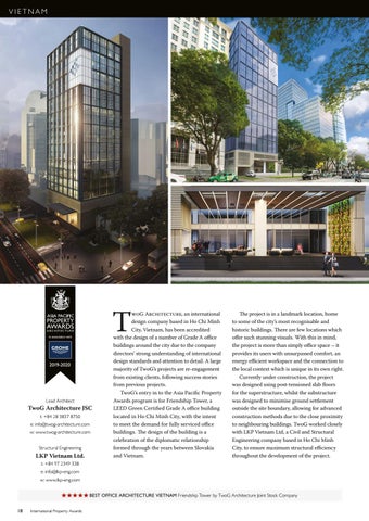 G A, an international design company based in Ho Chi Minh City, Vietnam, has been accredited with the design of a number of Grade A office buildings around the city due to the company directors’ strong understanding of international design standards and attention to detail. A large majority of TwoG’s projects are re-engagement from existing clients, following success stories from previous projects. TwoG’s entry in to the Asia Pacific Property Awards program is for Friendship Tower, a LEED Green Certified Grade A office building located in Ho Chi Minh City, with the intent to meet the demand for fully serviced office buildings. The design of the building is a celebration of the diplomatic relationship formed through the years between Slovakia and Vietnam.
